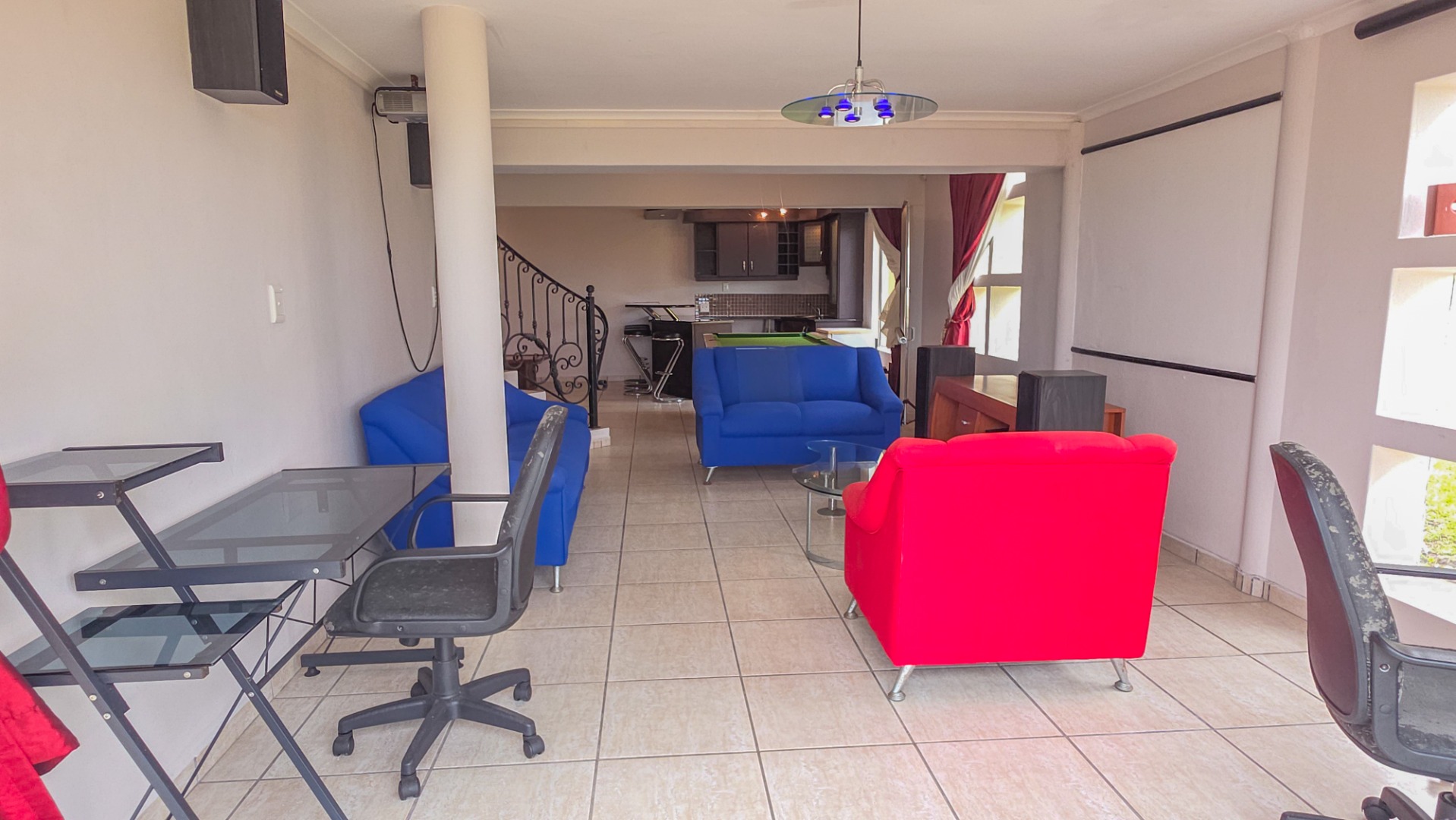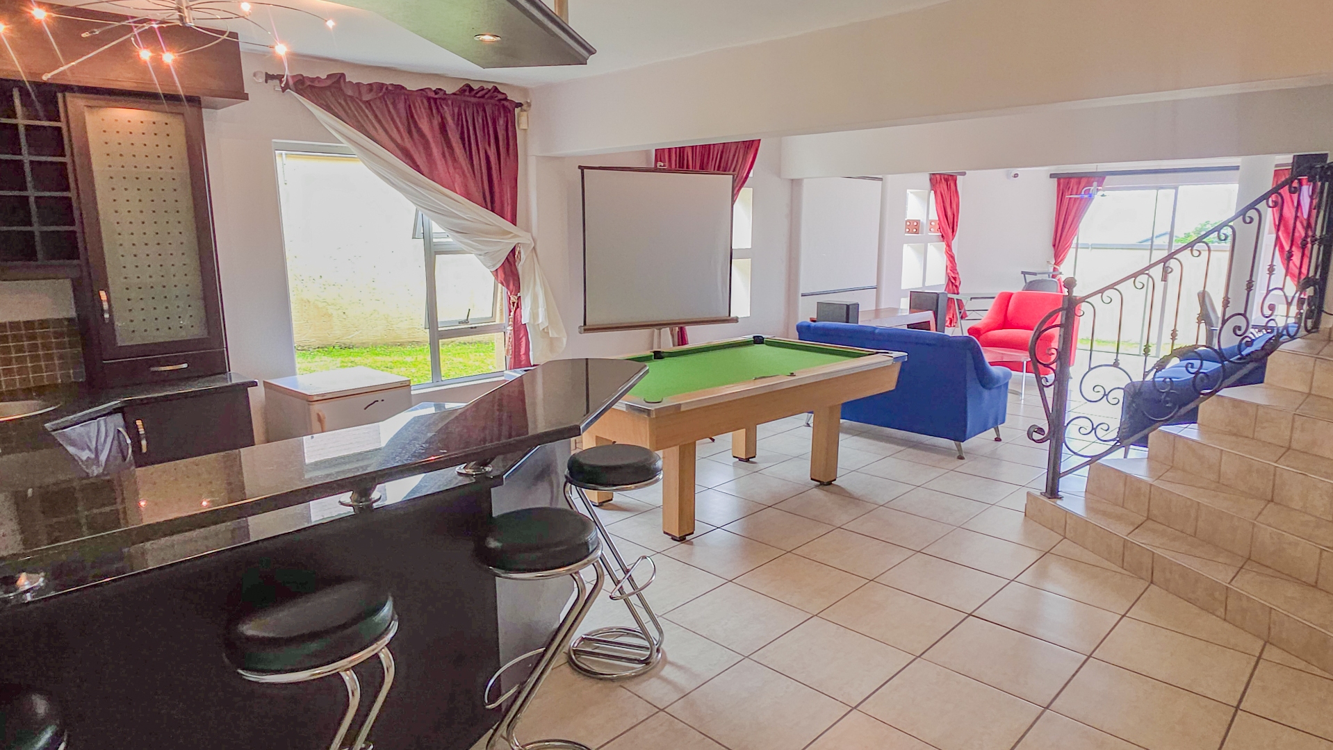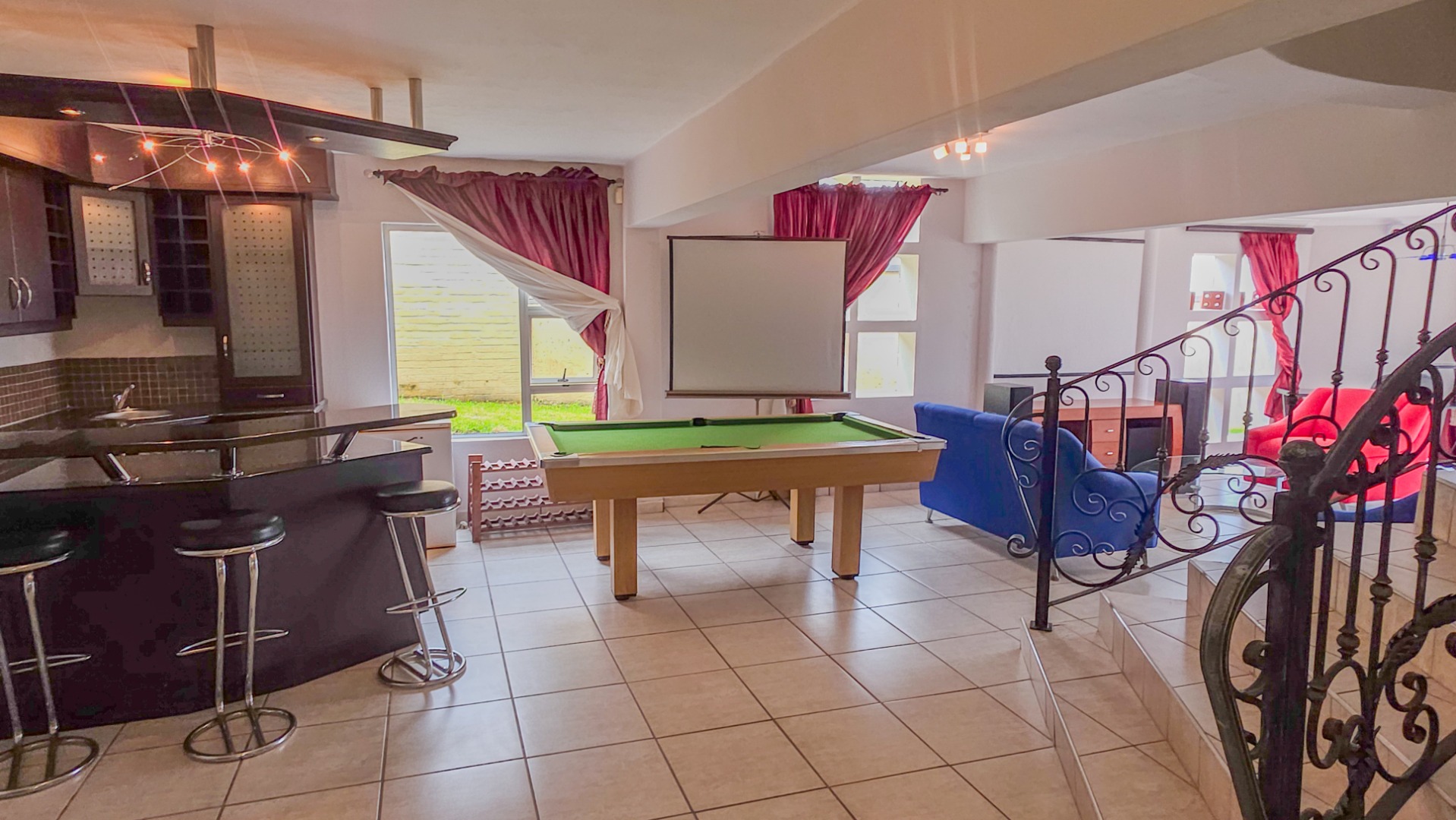 Downstairs, the home shifts into a private entertainment zone. A separate lounge with a kitchenette and projector setup creates the perfect cinema style space for family nights or relaxed gatherings. The downstairs bedroom is impressively sized, easily accommodating multiple beds, and includes its own en suite bathroom, making it ideal for guests or extended family.