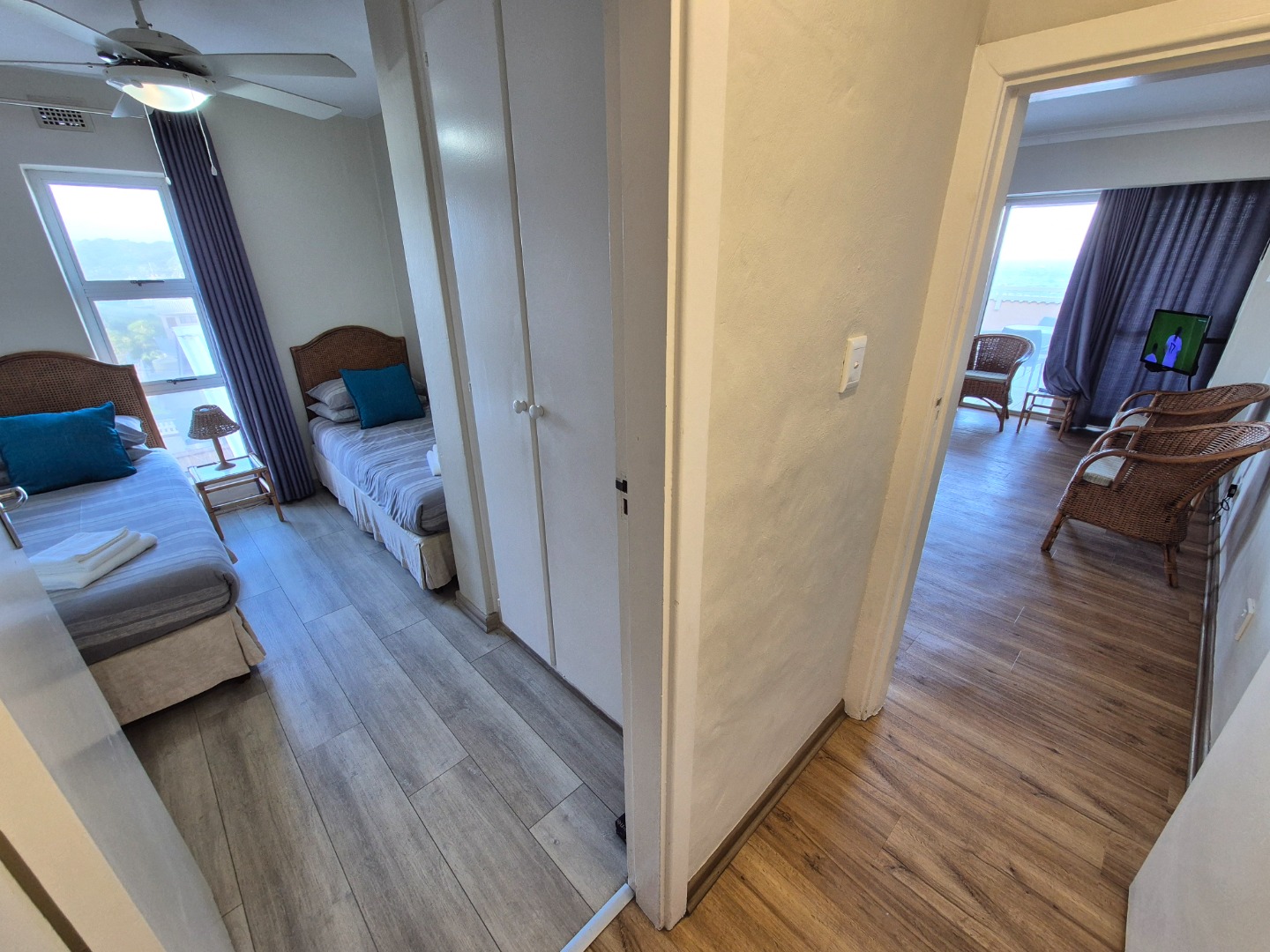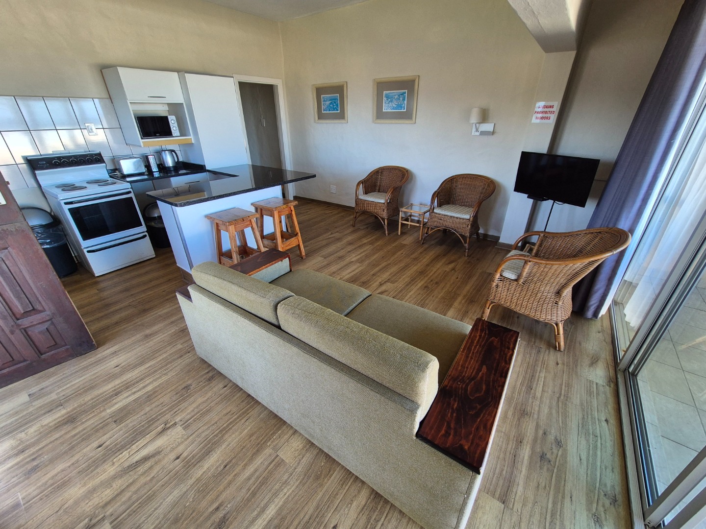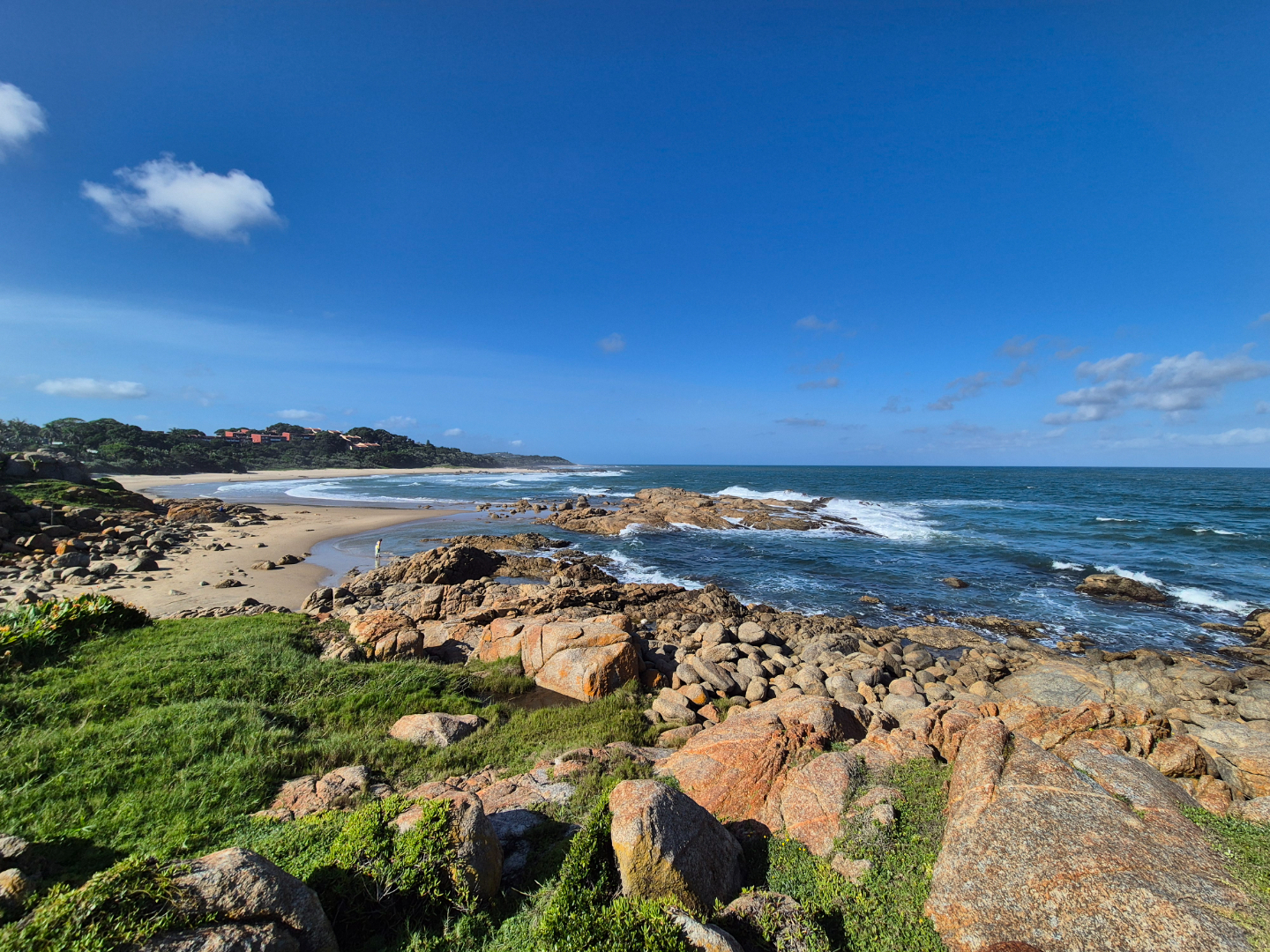 - Large private balcony with sea views across the Glenmore Beach strip and distinctive boulder rock formations