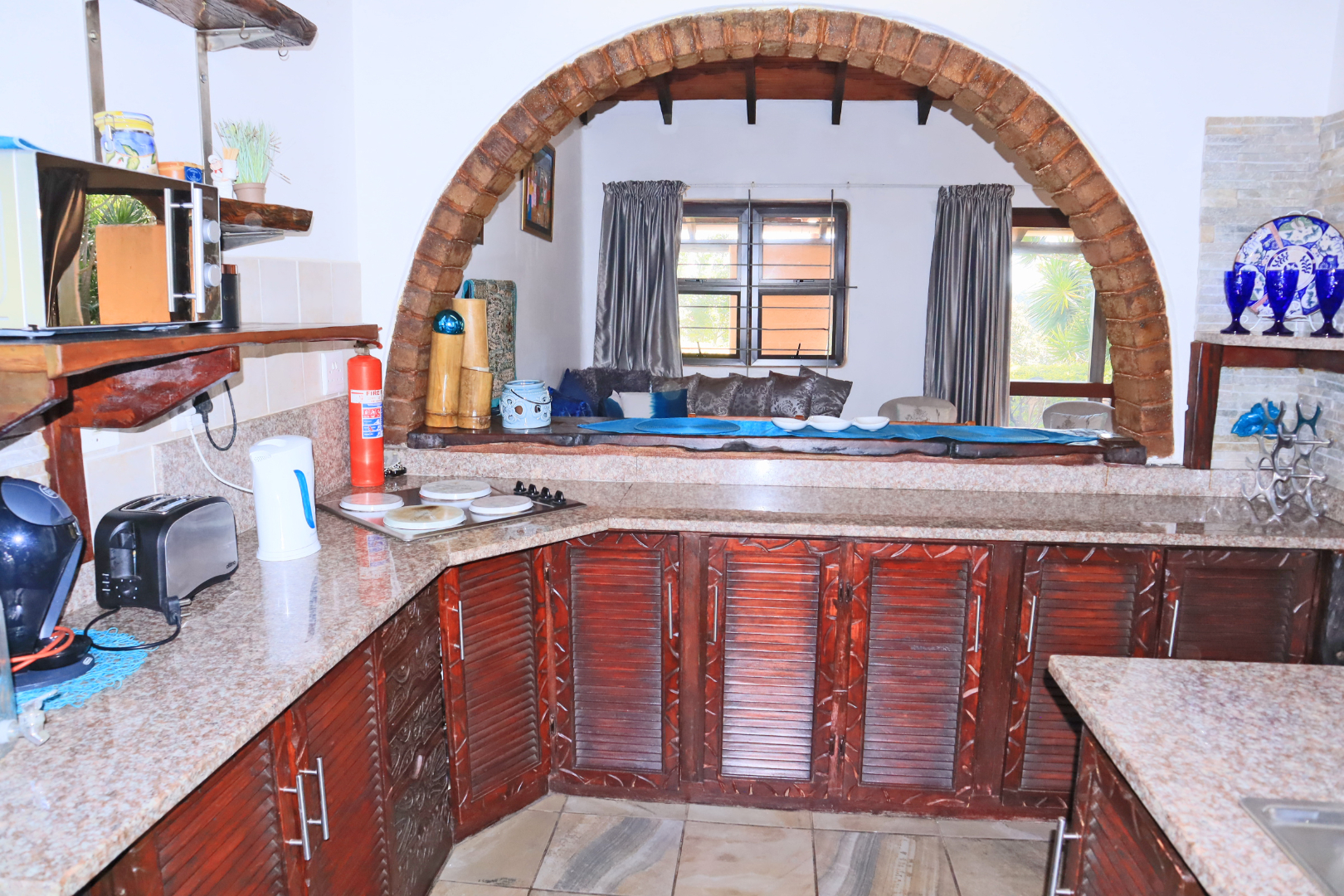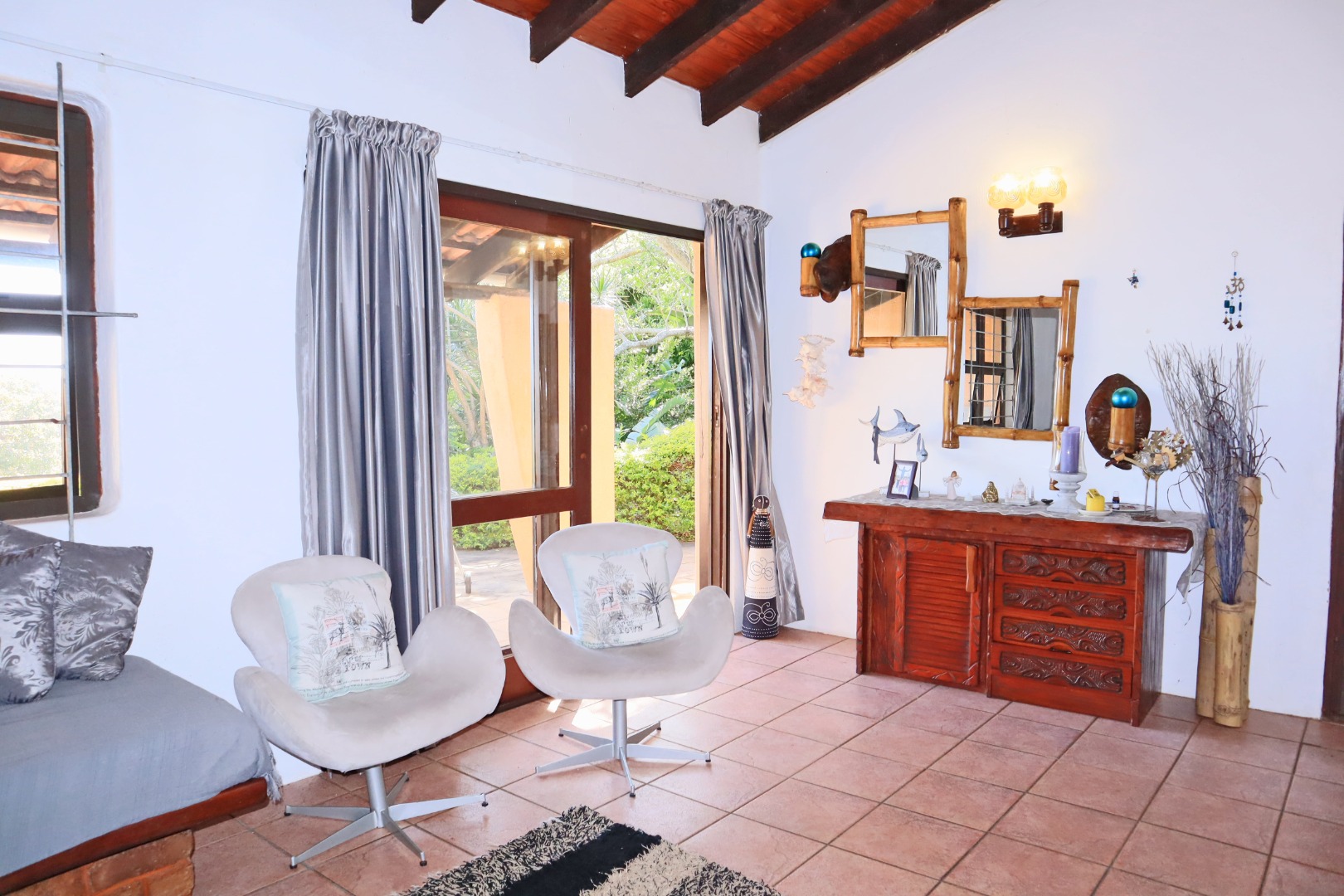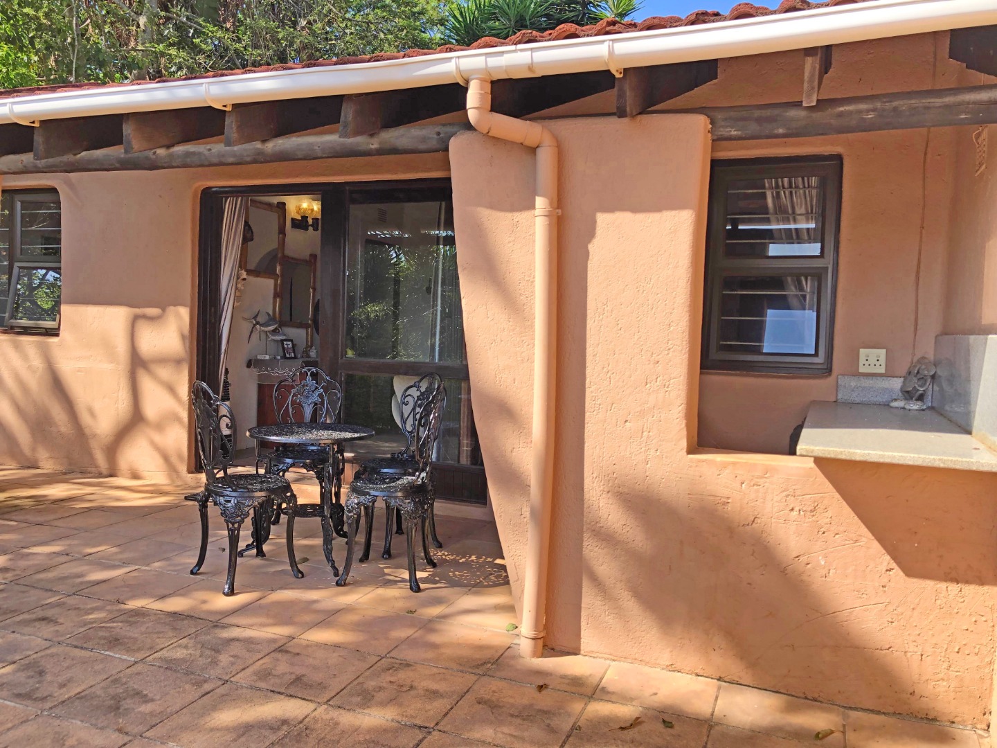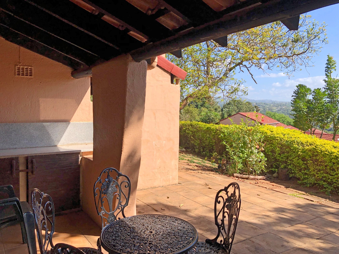 Discover a unique coastal retreat nestled within a secure complex in Glenmore, Port Edward. This charming 2-bedroom, 1-bathroom residence offers a comfortable 75 sqm of living space on an expansive 55922 sqm erf, providing a sense of country living with suburban convenience. The interior boasts a distinctive character, featuring a kitchen and bar area with durable granite countertops, rustic carved wooden cabinetry, and eye-catching brick archways that create an open flow to the lounge. The kitchen is well-equipped with a double sink, hob, and integrated washing machine, while the lounge impresses with exposed wooden ceiling beams, built-in L-shaped seating, and ample natural light. The property comes fully furnished, ready for immediate enjoyment. The two bedrooms are designed for comfort, each benefiting from natural light and the rustic charm of exposed wooden beams, complemented by security bars for peace of mind. The single bathroom is functionally appointed. Step outside to a private garden and patio area, perfect for relaxation or entertaining, all while enjoying the panoramic views of distant hills and orchards. Residents also benefit from access to a communal pool and clubhouse, enhancing the lifestyle offerings. With one dedicated parking space and a paved driveway, convenience is assured. The property is secured within a security complex and estate, featuring a security post and fencing, and includes water tanks for sustainability. Fibre connectivity is available, ensuring modern communication needs are met. Glenmore, situated in Port Edward, South Africa, offers an appealing blend of coastal beach access, aquatic activities, and marina proximity, making it ideal for those seeking a tranquil yet engaging lifestyle. This property presents an excellent opportunity to embrace secure, scenic living. Key Features: * 2 Bedrooms, 1 Bathroom * 75 sqm Floor Size on 55922 sqm Erf * Unique Rustic Kitchen with Granite Countertops * Lounge with Exposed Wooden Beams * Private Garden and Patio * Access to Communal Pool and Clubhouse * Panoramic Views * Fibre Connectivity * Secure Complex Living * Coastal Beach and Marina Proximity
