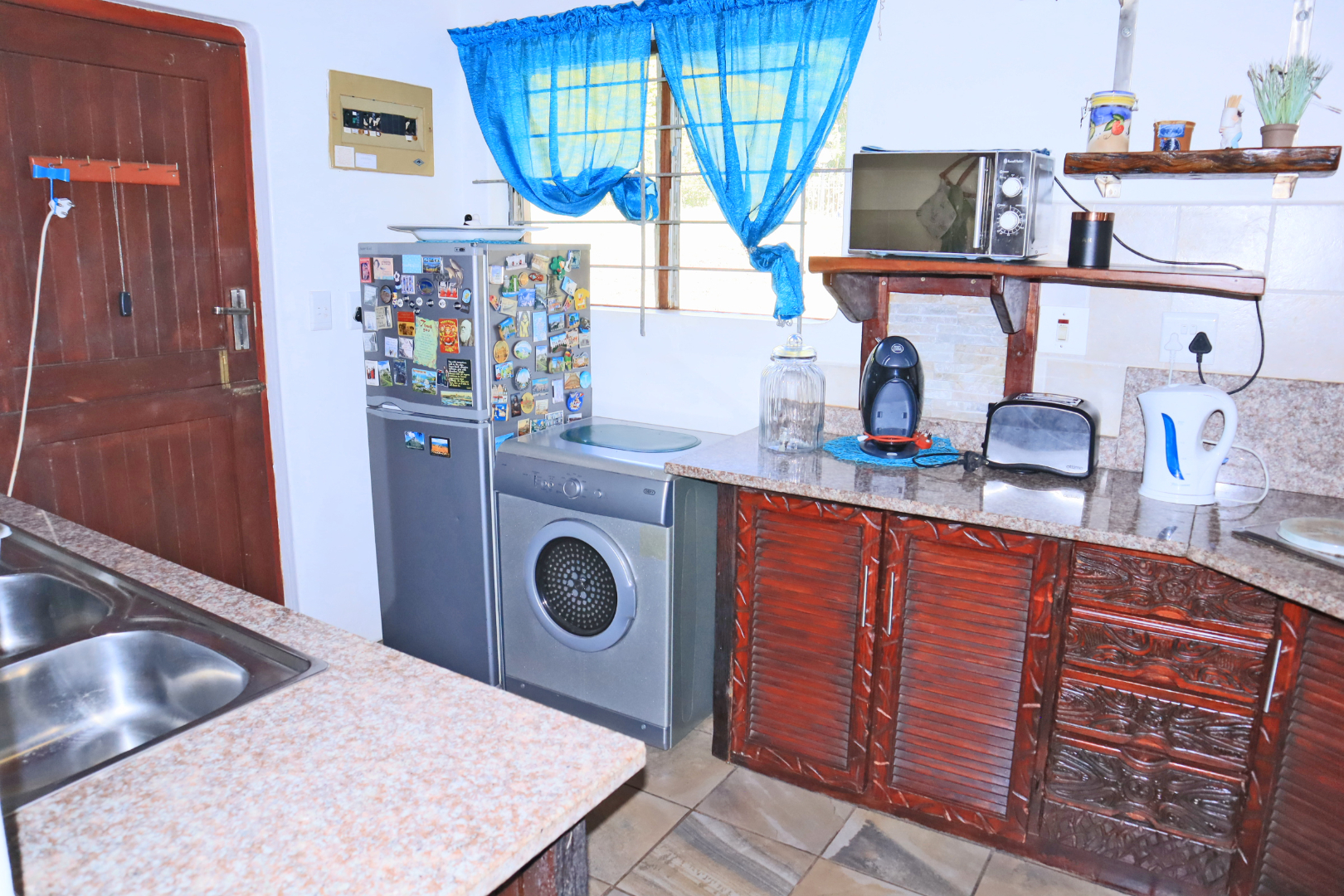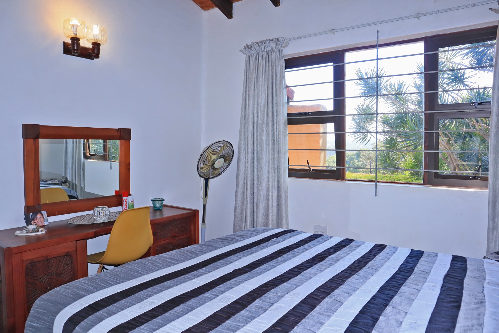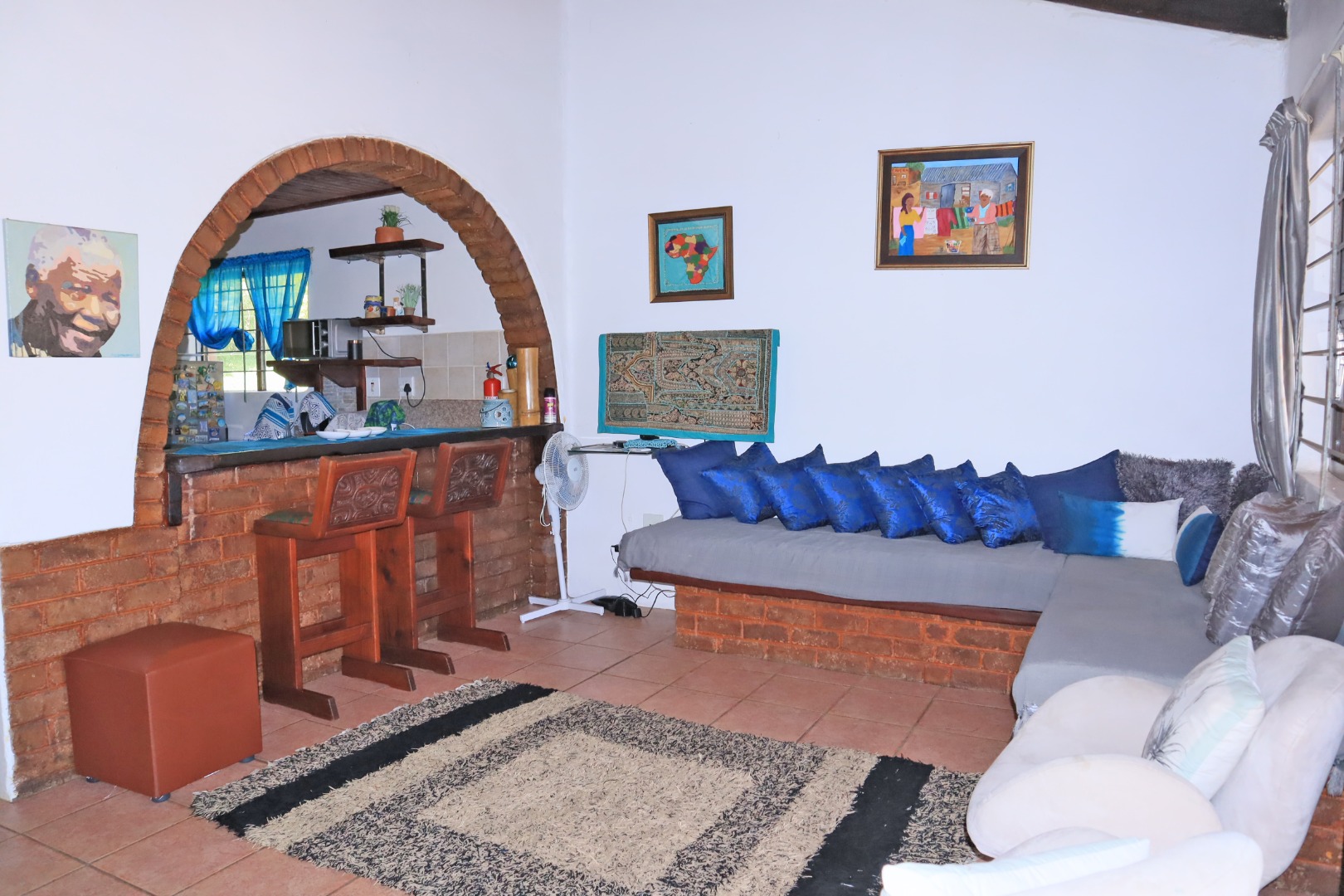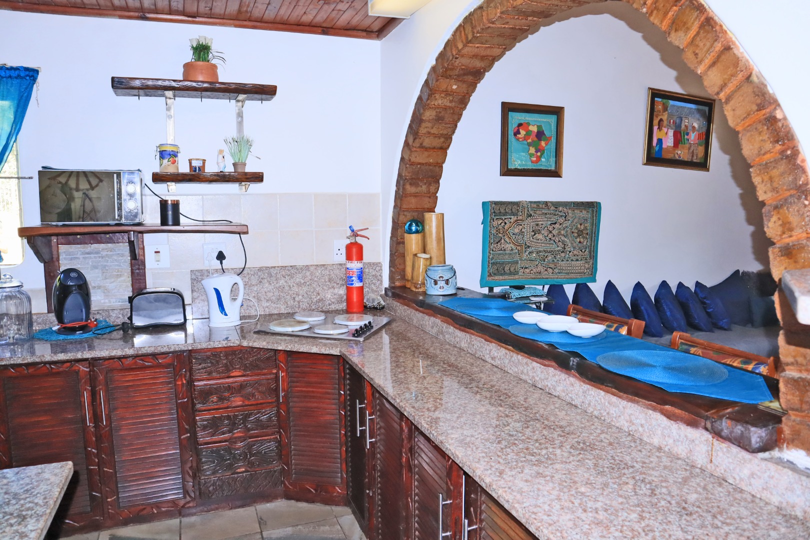 Discover a unique coastal retreat nestled within a secure complex in Glenmore, Port Edward. This charming 2-bedroom, 1-bathroom residence offers a comfortable 75 sqm of living space on an expansive 55922 sqm erf, providing a sense of country living with suburban convenience. The interior boasts a distinctive character, featuring a kitchen and bar area with durable granite countertops, rustic carved wooden cabinetry, and eye-catching brick archways that create an open flow to the lounge. The kitchen is well-equipped with a double sink, hob, and integrated washing machine, while the lounge impresses with exposed wooden ceiling beams, built-in L-shaped seating, and ample natural light. The property comes fully furnished, ready for immediate enjoyment. The two bedrooms are designed for comfort, each benefiting from natural light and the rustic charm of exposed wooden beams, complemented by security bars for peace of mind. The single bathroom is functionally appointed. Step outside to a private garden and patio area, perfect for relaxation or entertaining, all while enjoying the panoramic views of distant hills and orchards. Residents also benefit from access to a communal pool and clubhouse, enhancing the lifestyle offerings. With one dedicated parking space and a paved driveway, convenience is assured. The property is secured within a security complex and estate, featuring a security post and fencing, and includes water tanks for sustainability. Fibre connectivity is available, ensuring modern communication needs are met. Glenmore, situated in Port Edward, South Africa, offers an appealing blend of coastal beach access, aquatic activities, and marina proximity, making it ideal for those seeking a tranquil yet engaging lifestyle. This property presents an excellent opportunity to embrace secure, scenic living. Key Features: * 2 Bedrooms, 1 Bathroom * 75 sqm Floor Size on 55922 sqm Erf * Unique Rustic Kitchen with Granite Countertops * Lounge with Exposed Wooden Beams * Private Garden and Patio * Access to Communal Pool and Clubhouse * Panoramic Views * Fibre Connectivity * Secure Complex Living * Coastal Beach and Marina Proximity