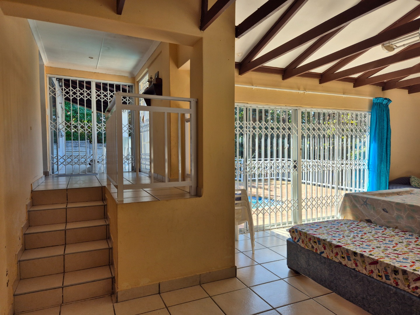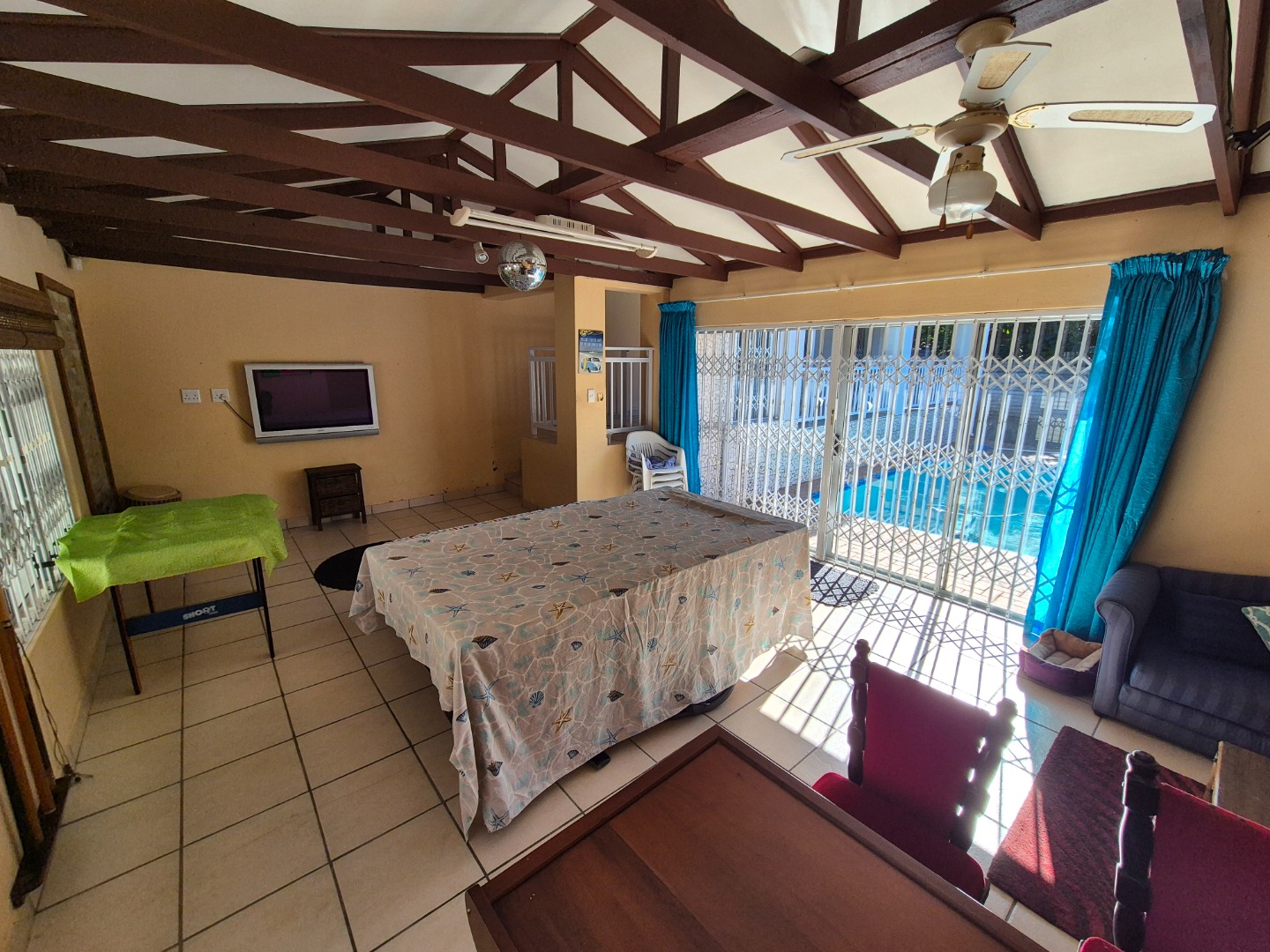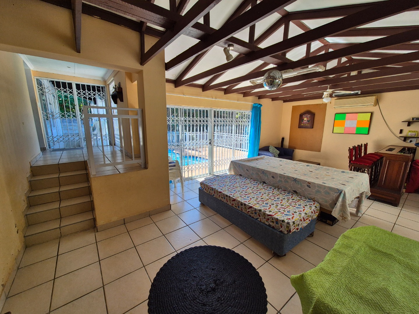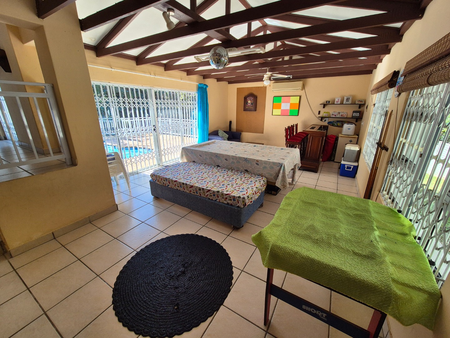 A standout feature is the separate entertainment living area, perfectly sized to accommodate a built-in bar, pool table and a cosy lounge setup. This versatile space opens directly onto the pool area, making it ideal for poolside gatherings, weekend braais and relaxed afternoons spent enjoying the sunshine.