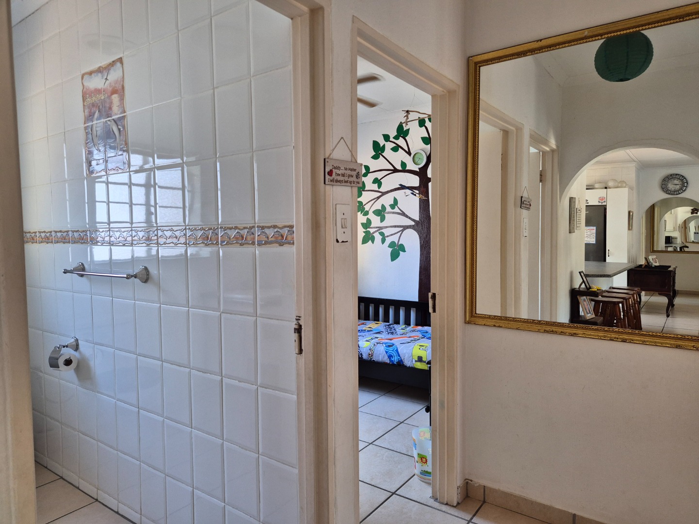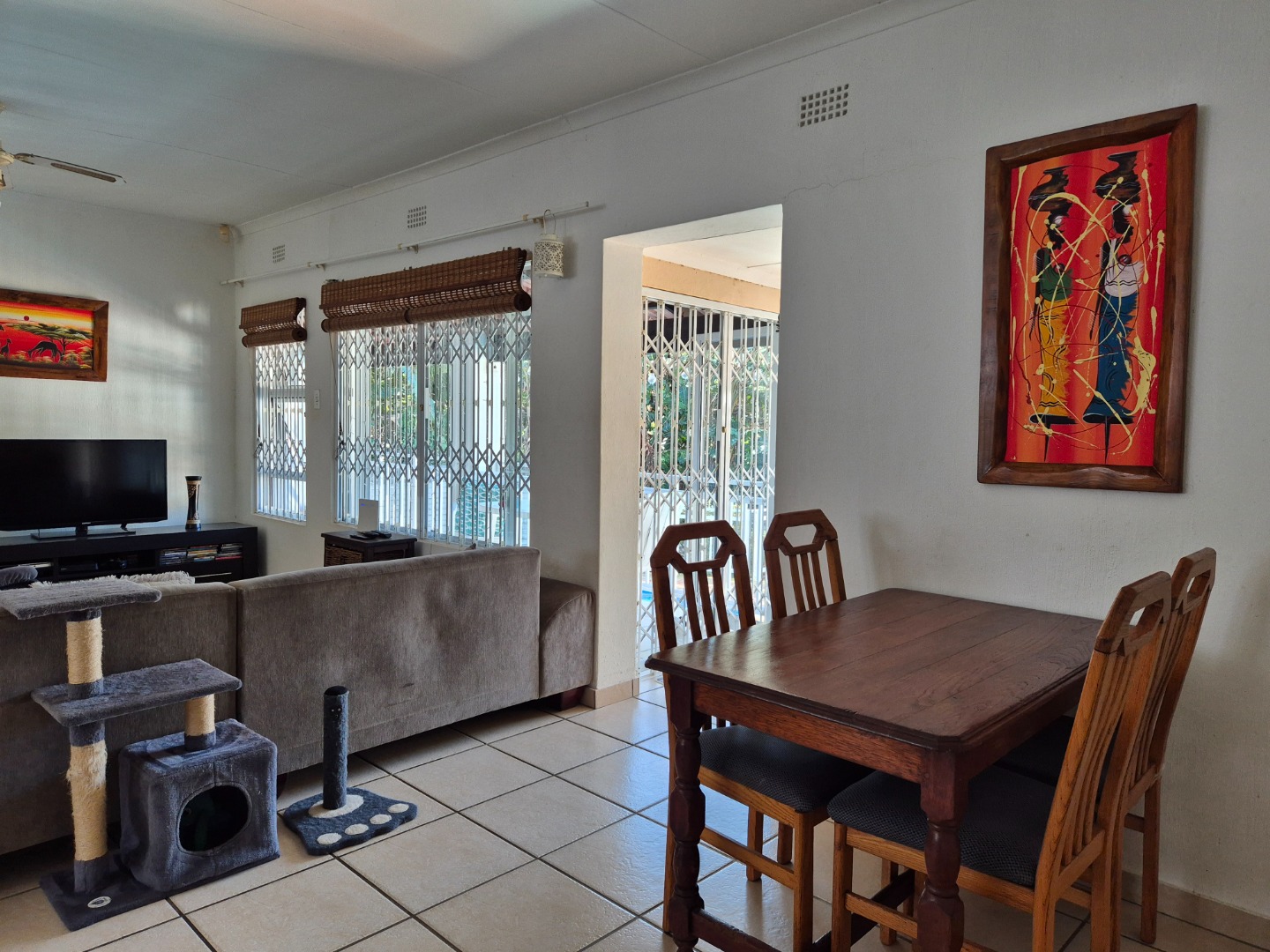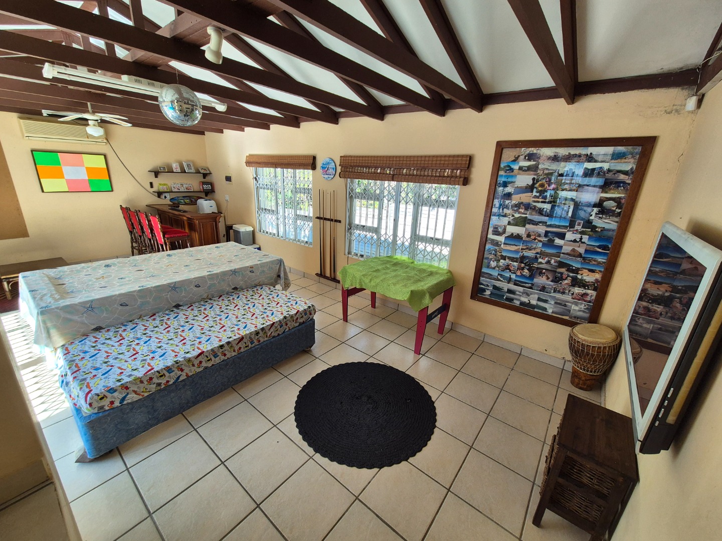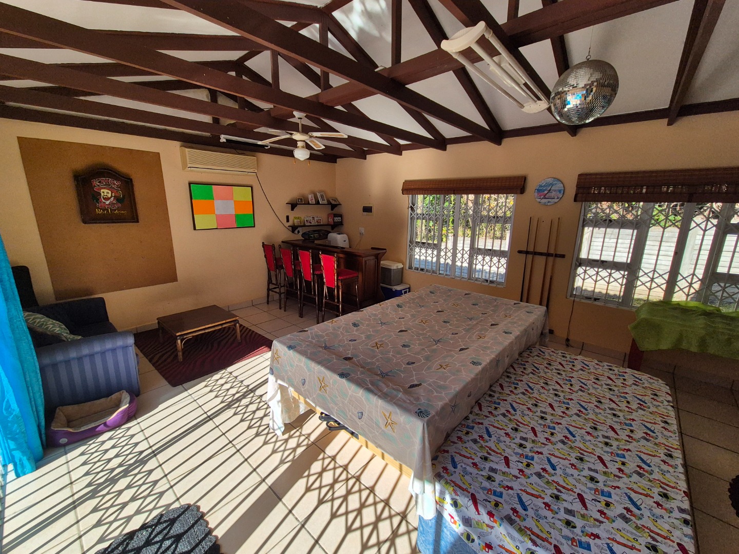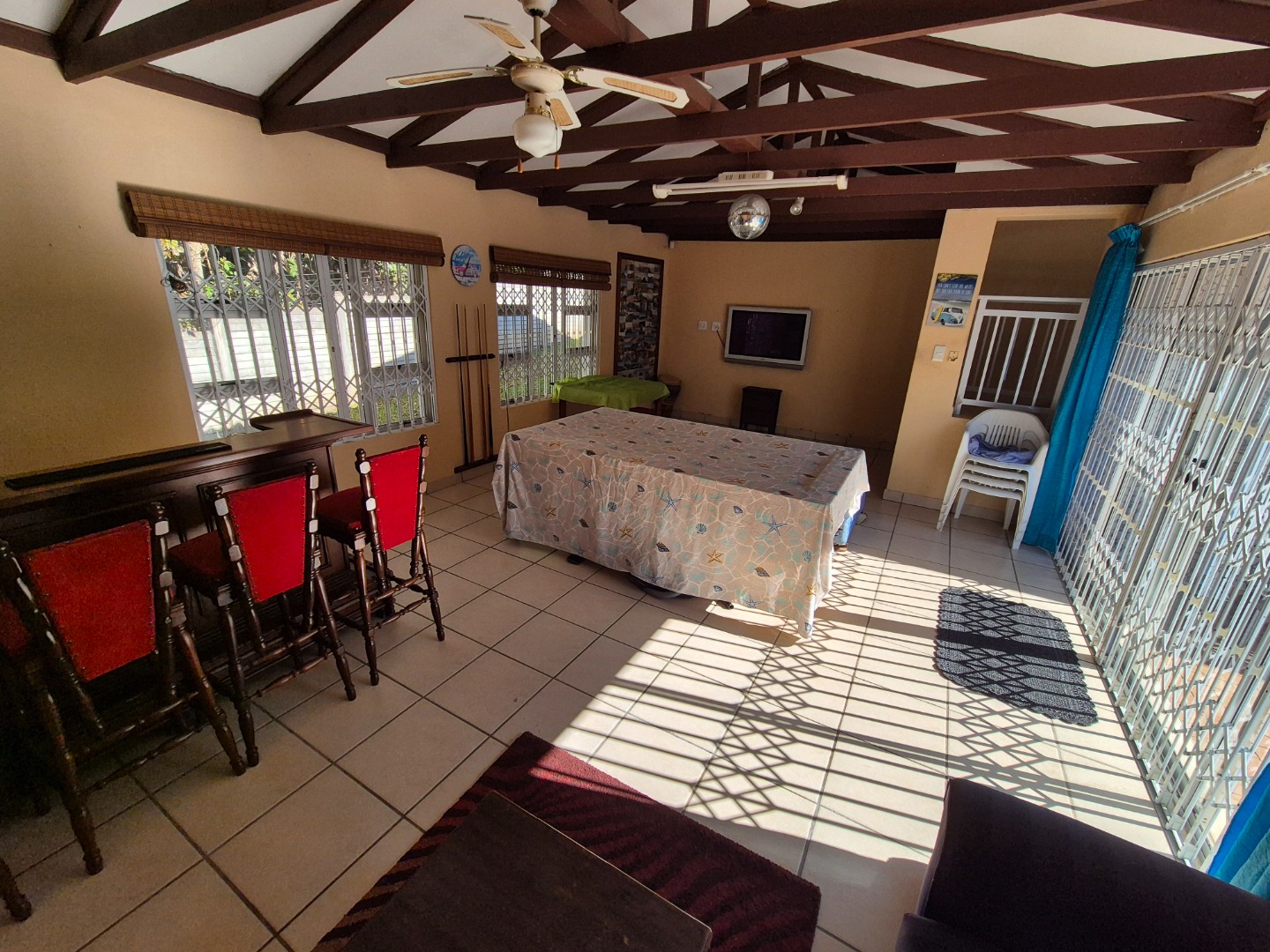 A standout feature is the separate entertainment living area, perfectly sized to accommodate a built-in bar, pool table and a cosy lounge setup. This versatile space opens directly onto the pool area, making it ideal for poolside gatherings, weekend braais and relaxed afternoons spent enjoying the sunshine.
