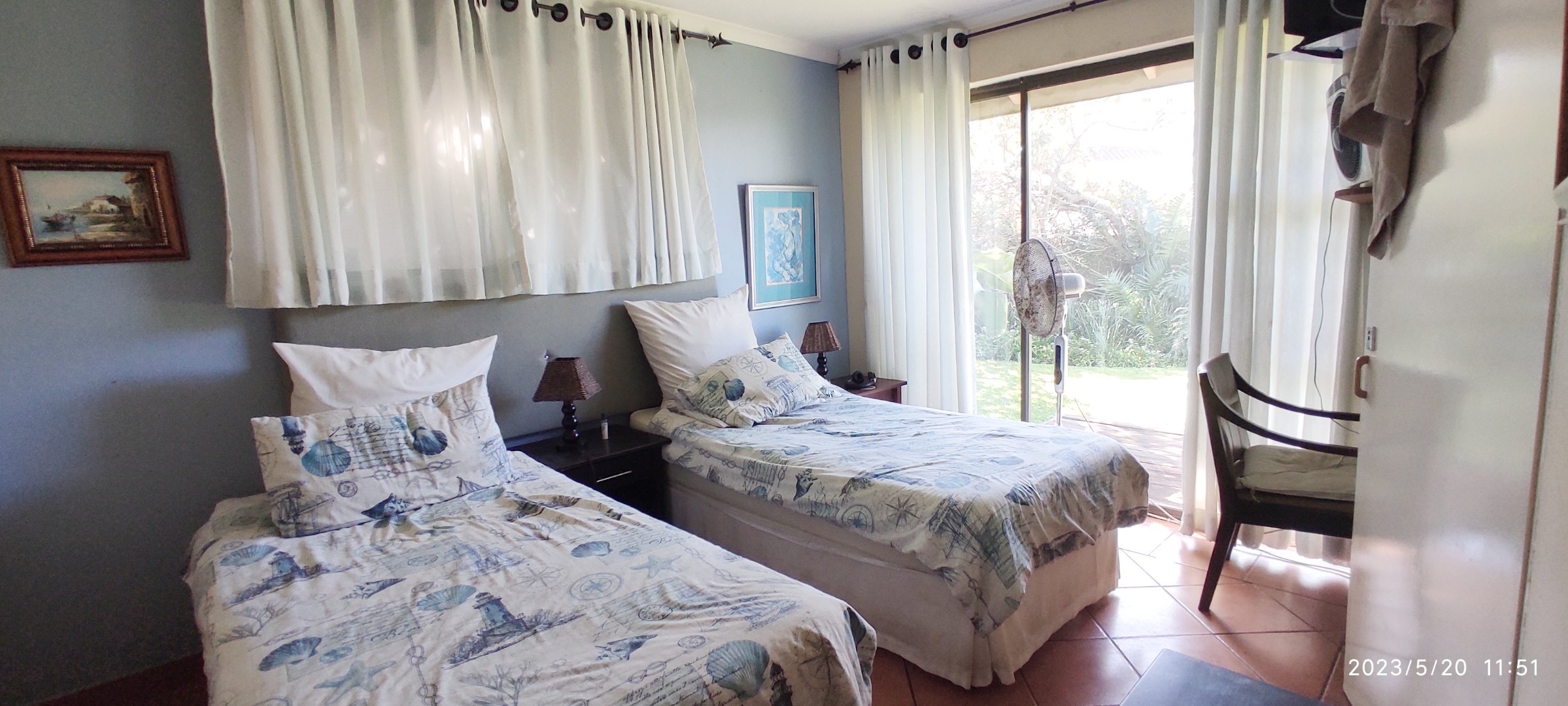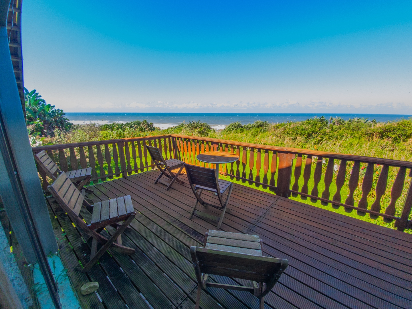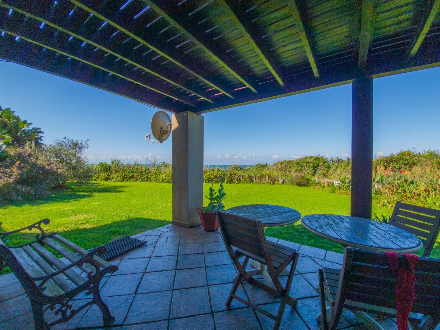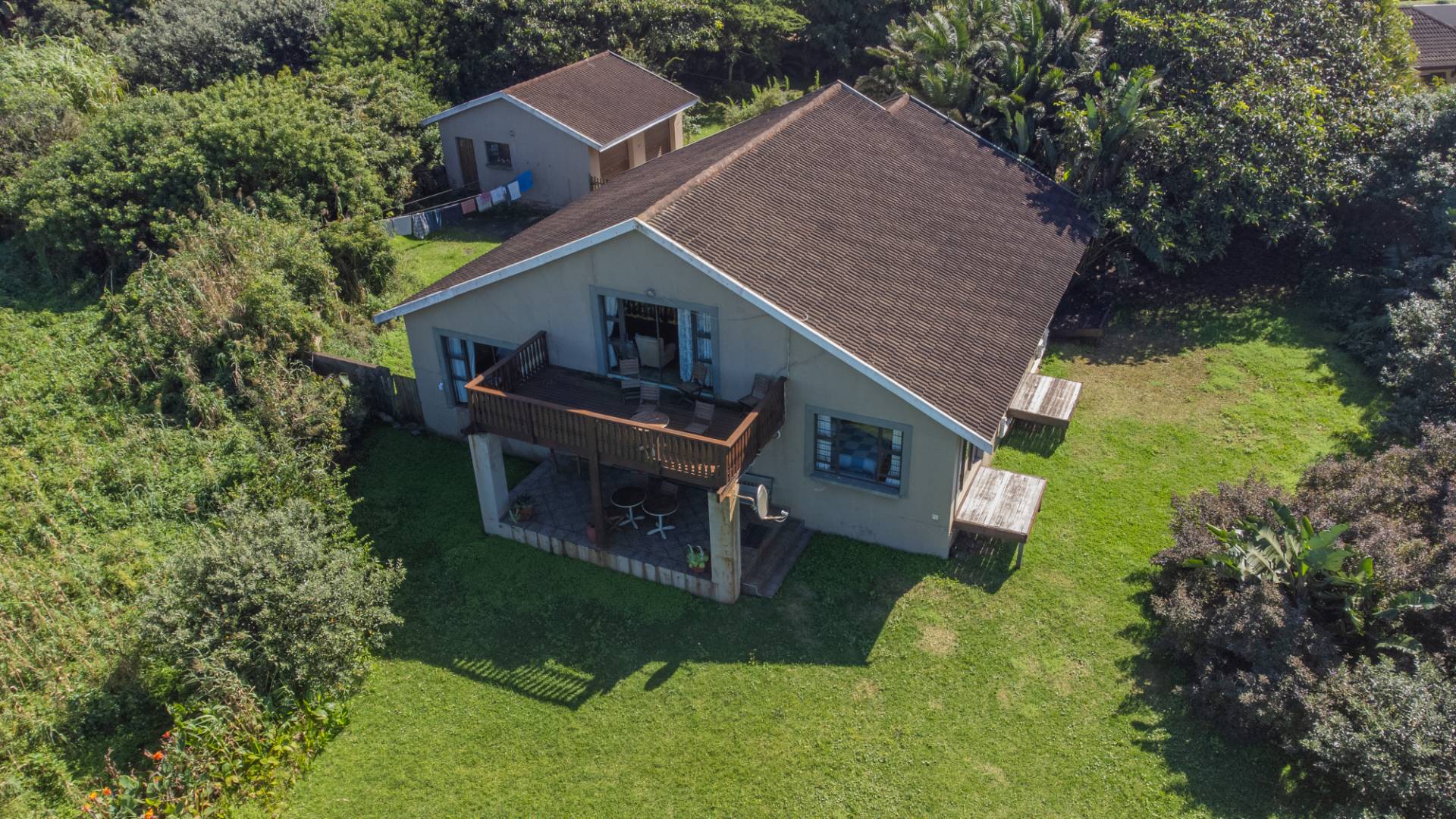 There are three identical guest rooms on the left of the house with own identical bathrooms on-suite, with own entries. Each room has a coffee station, television and sliding doors onto own wooden patio. Lovely braai and seating area under huge trees for guests. Master bedroom is to the right, being very private from guests, and very spacious with walk through cupboards and a lovely full bathroom on-suite with beautiful views onto the gardens. Double garages and lots of secure parking space. 2500L water tank for back up water. Exit through a gate in front and you are on the stunning beach within a few steps. House is in a very quiet safe area of Port Edward so you will feel like you are on your own private beach. Guest house license and furniture for the 3 guest suites are negotiable with the owner. House have an alarm system and automated gates. Port Edward is a lovely town offering everything you need. Wild Coast Sun is only 5 minutes away - with lots of entertainment and restaurants to please all. Best location for the golfing fanatics, as there are plenty award winning golf courses within half an hour drive. Also the perfect spot for outdoor and aquatic activities. Call me for a visit and let me show you the potential of this home - lots of space to dream of more!
