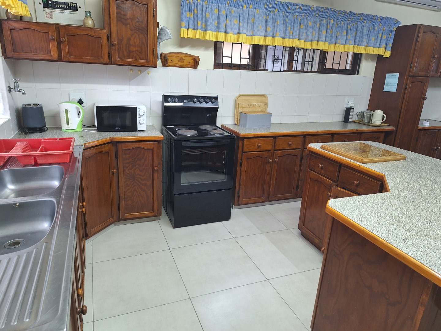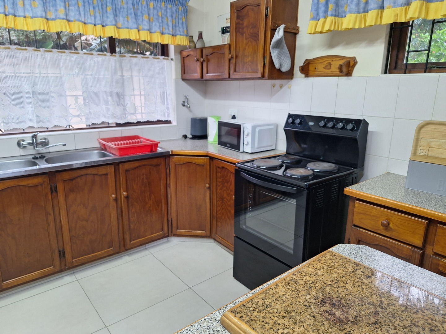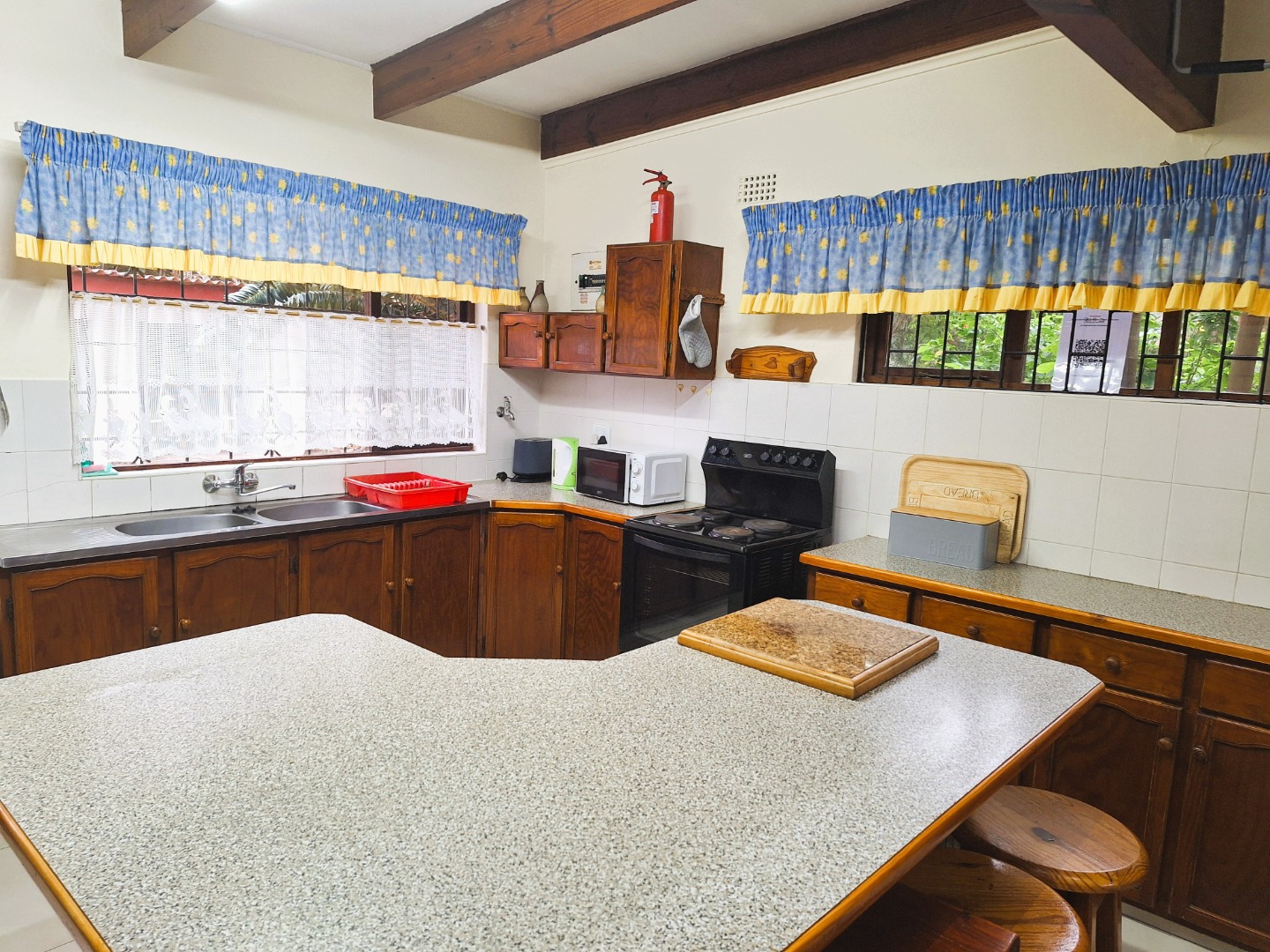The interior features an inviting open-plan layout, seamlessly connecting the lounge and dining areas. The functional kitchen is equipped with ample wooden cabinetry and counter space, perfect for family meals and entertaining. Each of the three bedrooms provides comfortable accommodation, complemented by two well-appointed bathrooms, including one ensuite for added privacy. Air conditioning units ensure comfort throughout the home, while exposed wooden ceiling beams add a touch of rustic character.