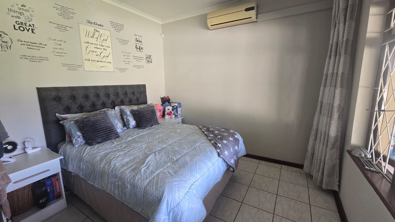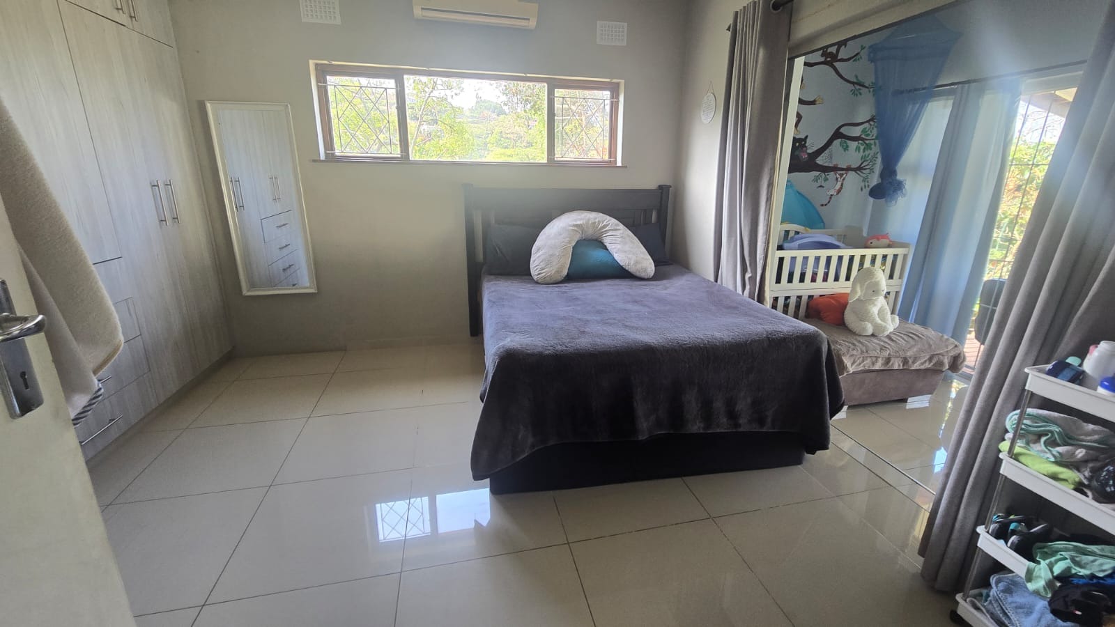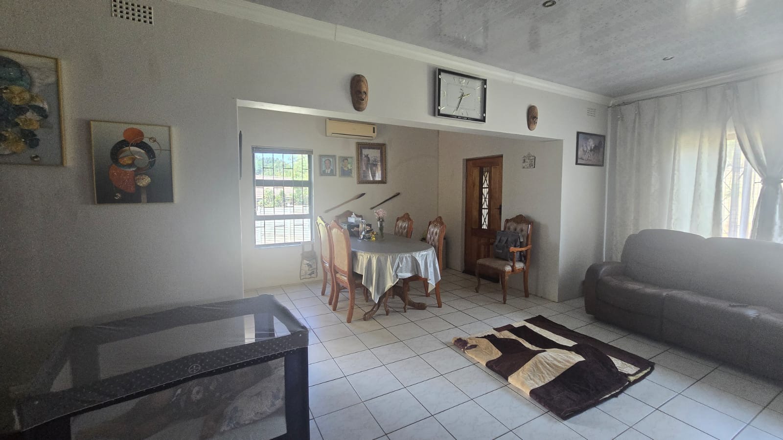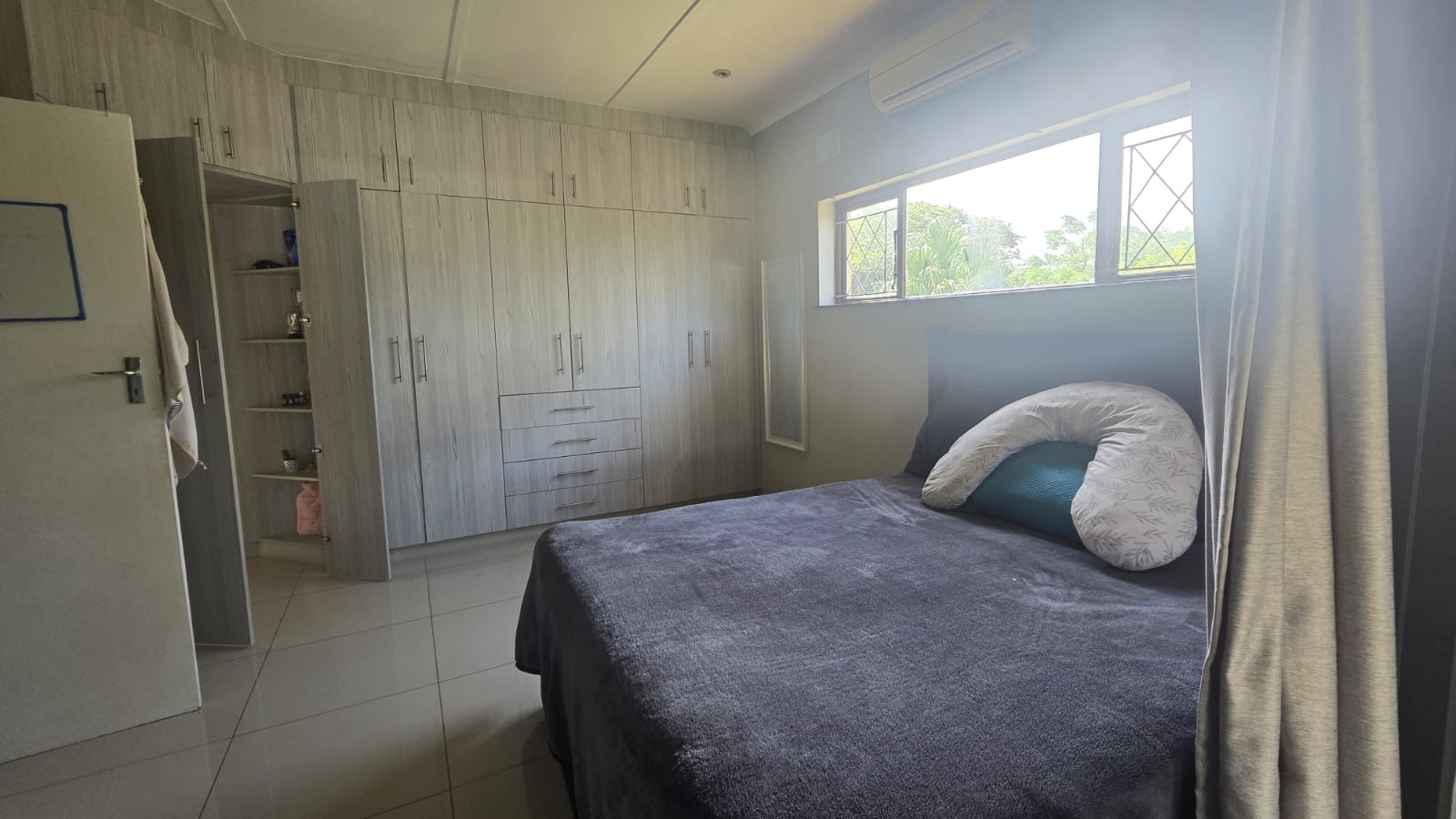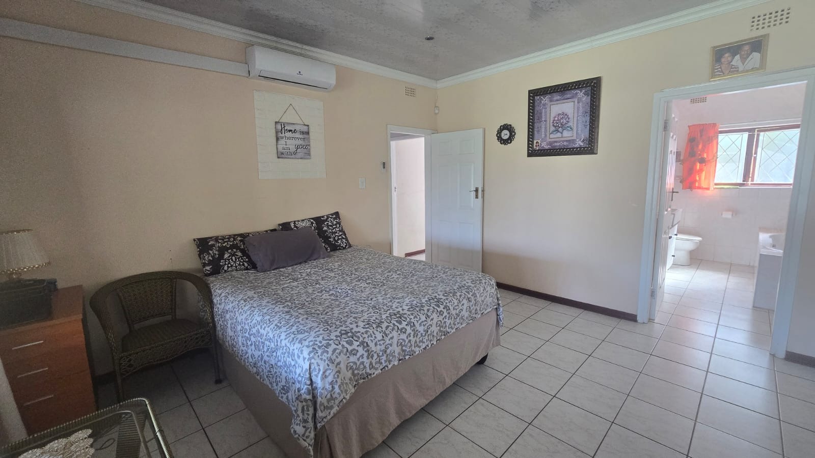 This spacious and well-maintained home features three bedrooms and three bathrooms, including a main en-suite. The interior is fully tiled throughout, showcasing high ceilings and air conditioners in the bedrooms for year-round comfort. The main bedroom offers generous space with built-in wardrobes.