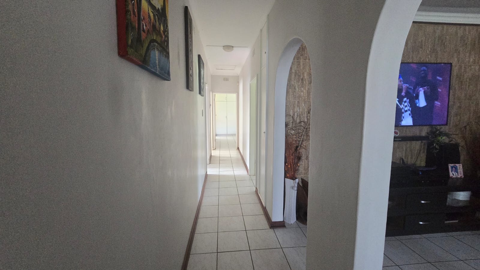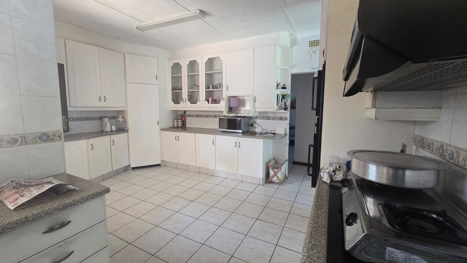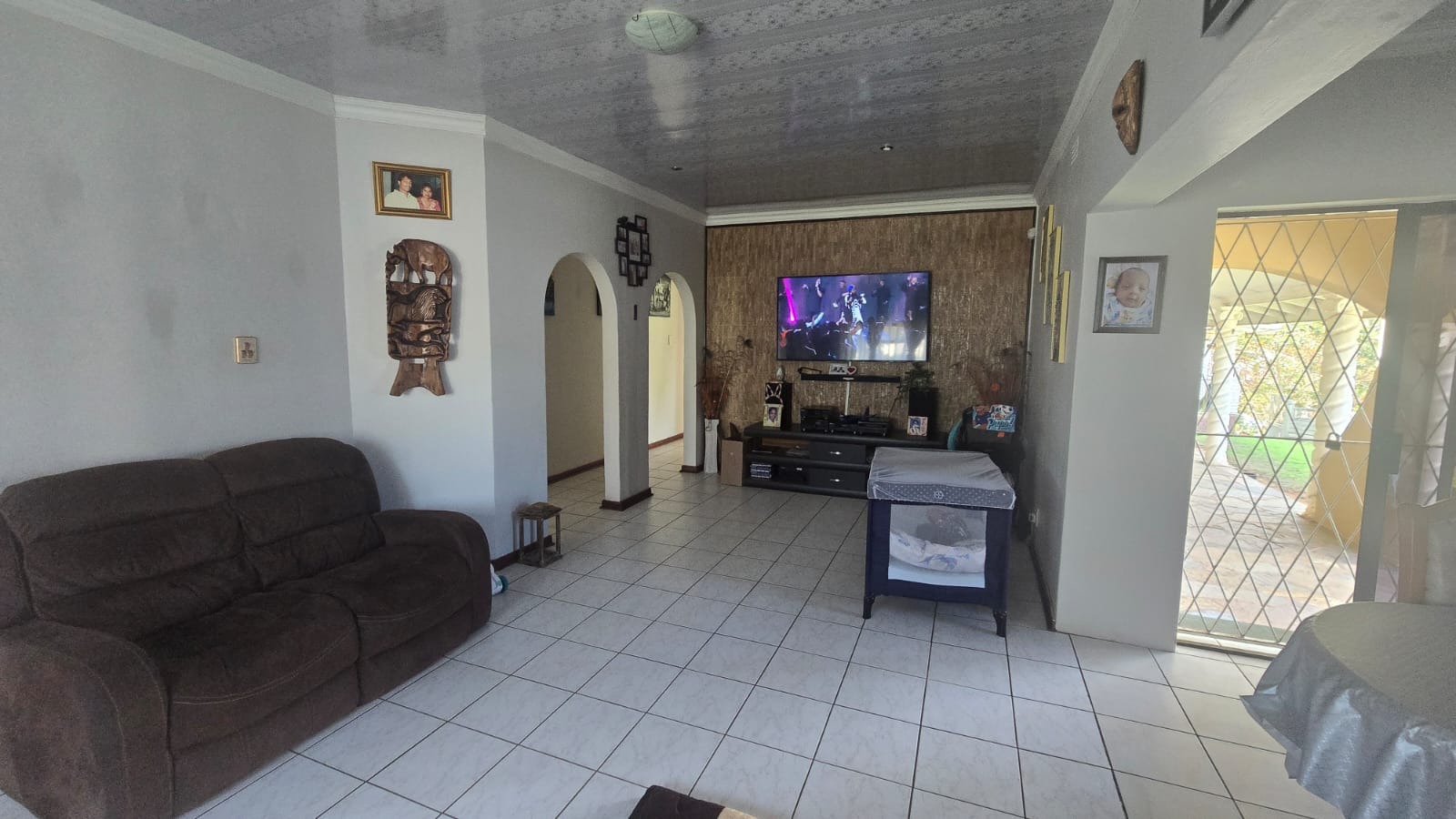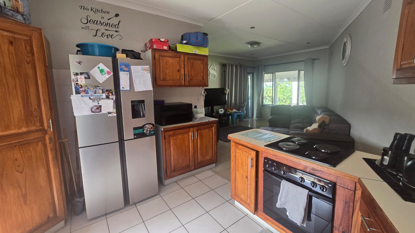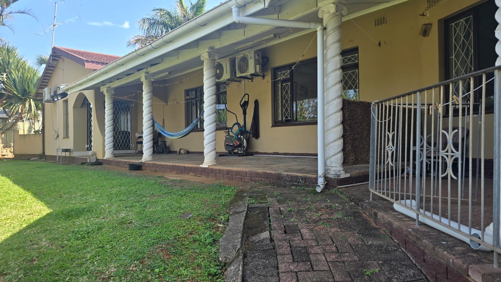 This spacious and well-maintained home features three bedrooms and three bathrooms, including a main en-suite. The interior is fully tiled throughout, showcasing high ceilings and air conditioners in the bedrooms for year-round comfort. The main bedroom offers generous space with built-in wardrobes.