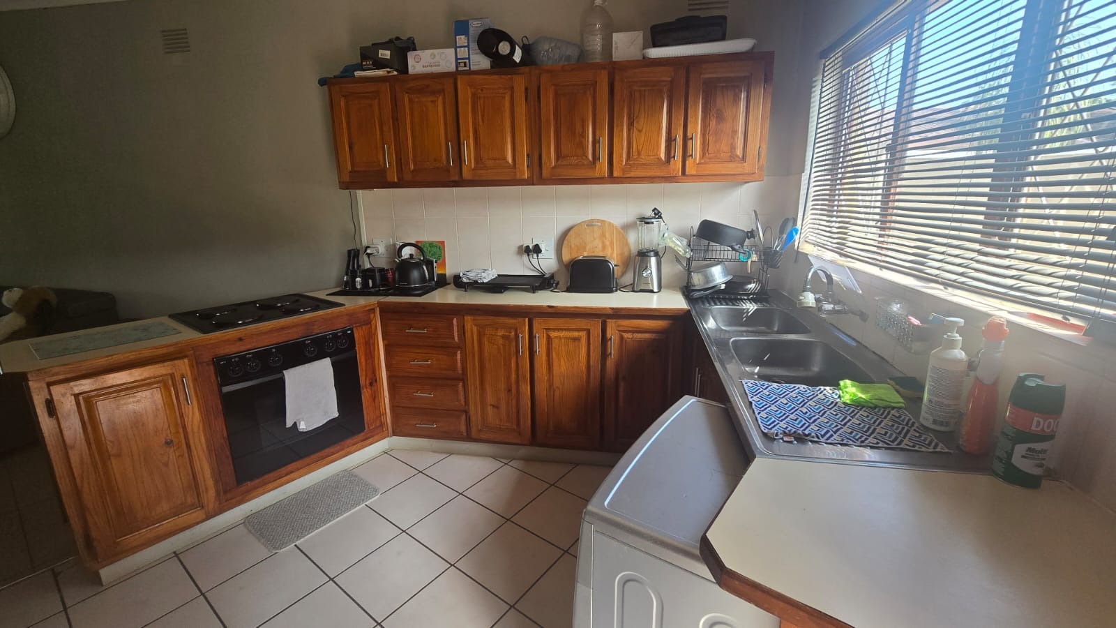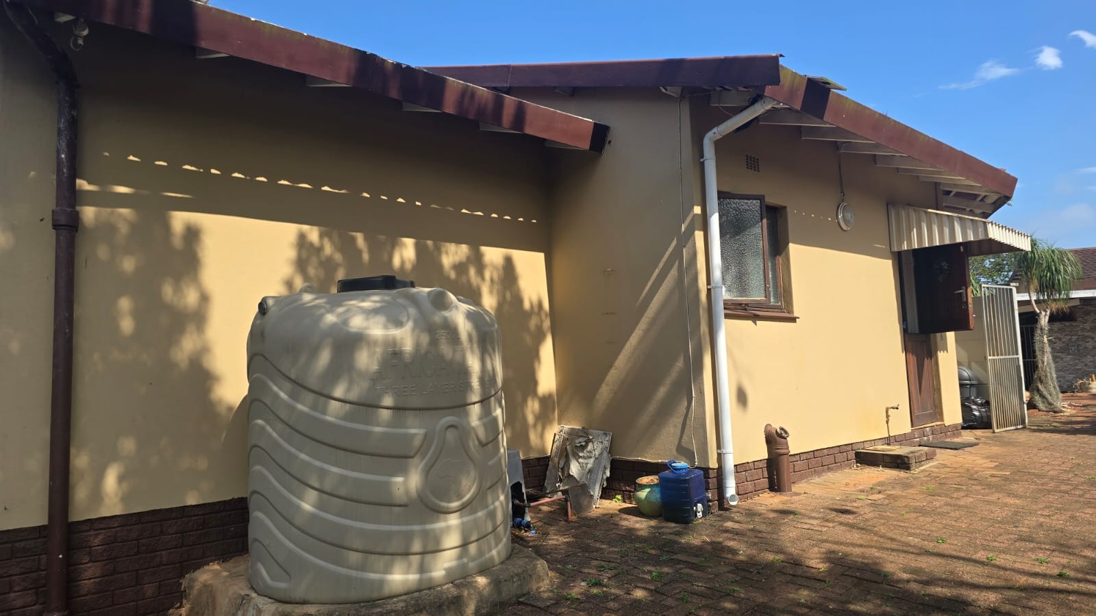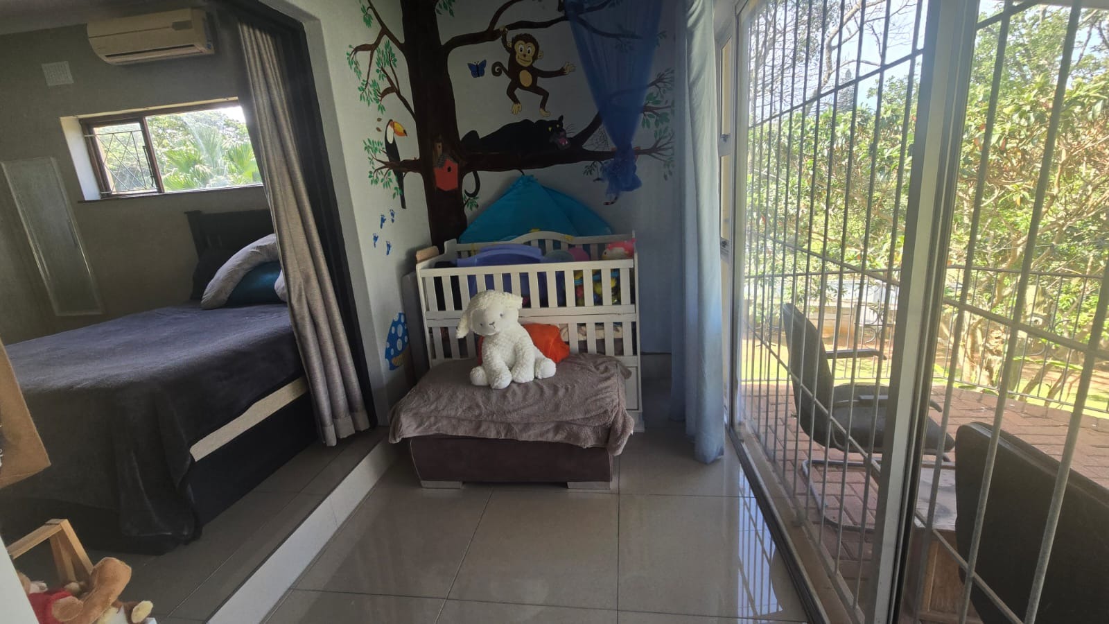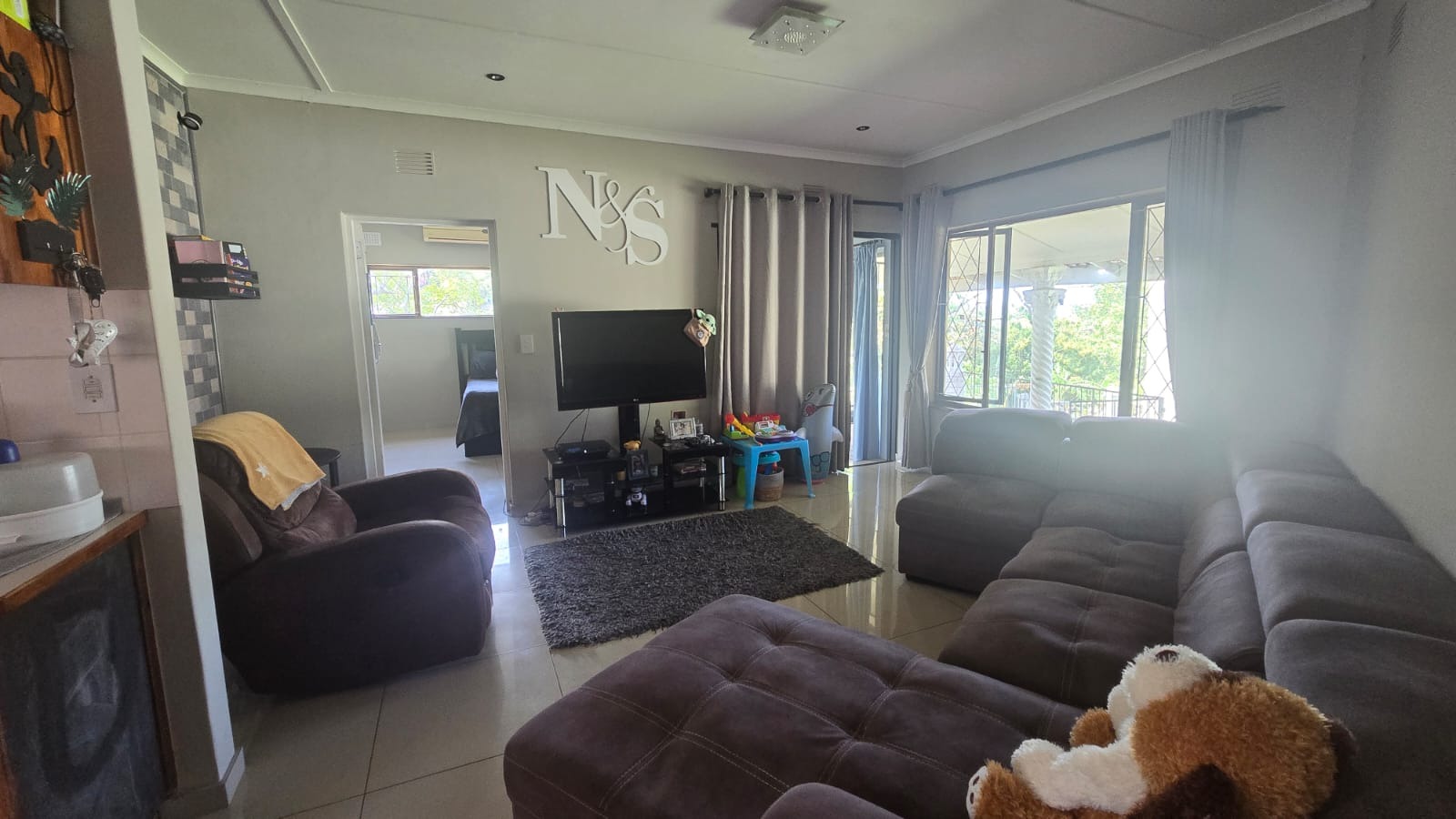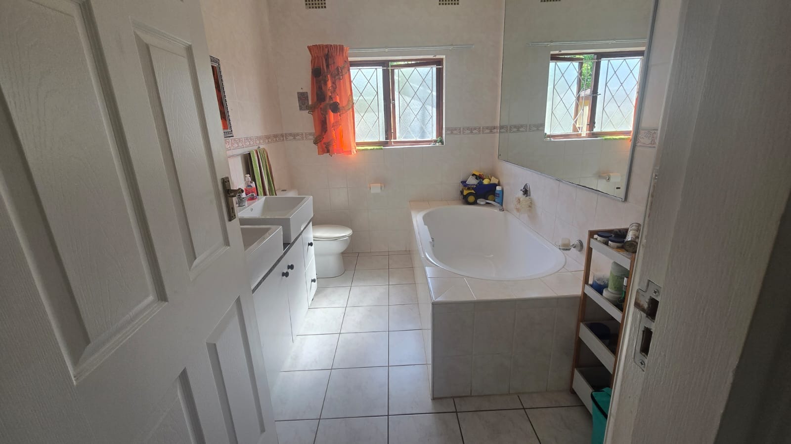 This spacious and well-maintained home features three bedrooms and three bathrooms, including a main en-suite. The interior is fully tiled throughout, showcasing high ceilings and air conditioners in the bedrooms for year-round comfort. The main bedroom offers generous space with built-in wardrobes.