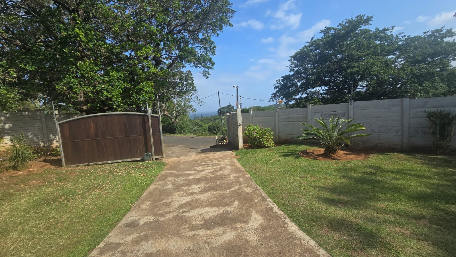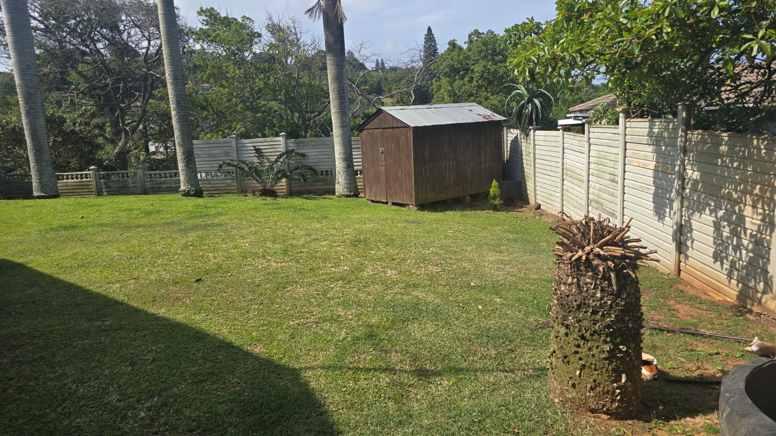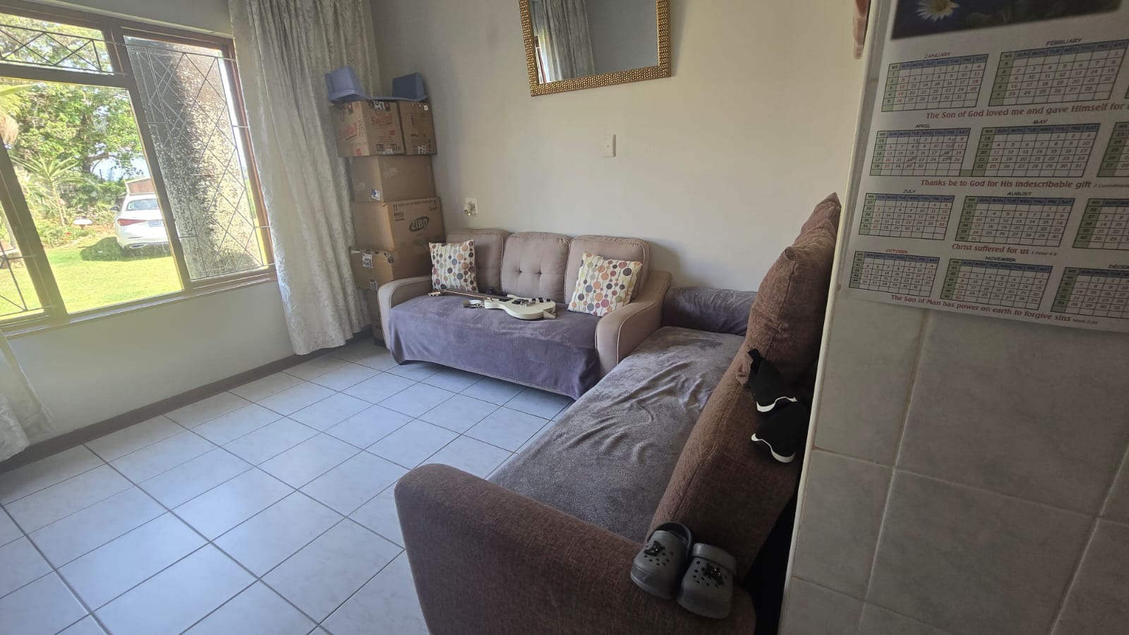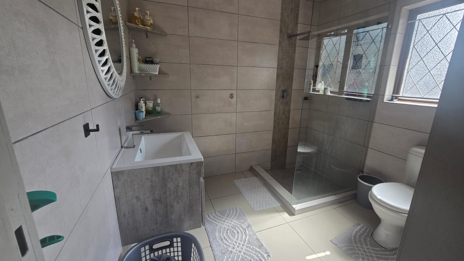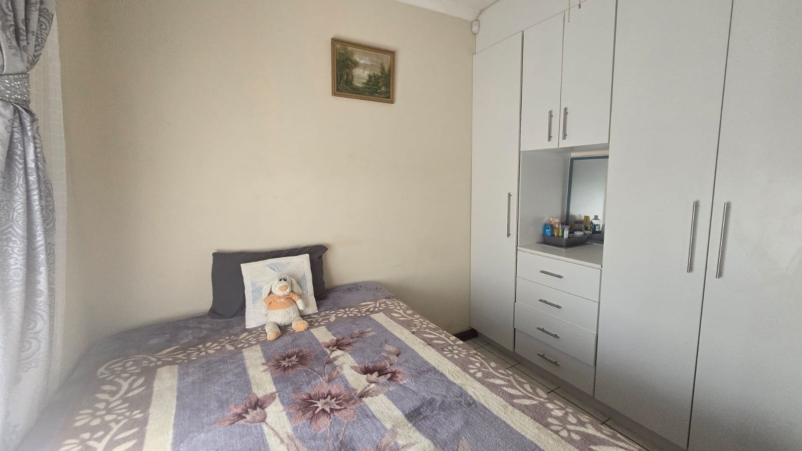 This spacious and well-maintained home features three bedrooms and three bathrooms, including a main en-suite. The interior is fully tiled throughout, showcasing high ceilings and air conditioners in the bedrooms for year-round comfort. The main bedroom offers generous space with built-in wardrobes.
