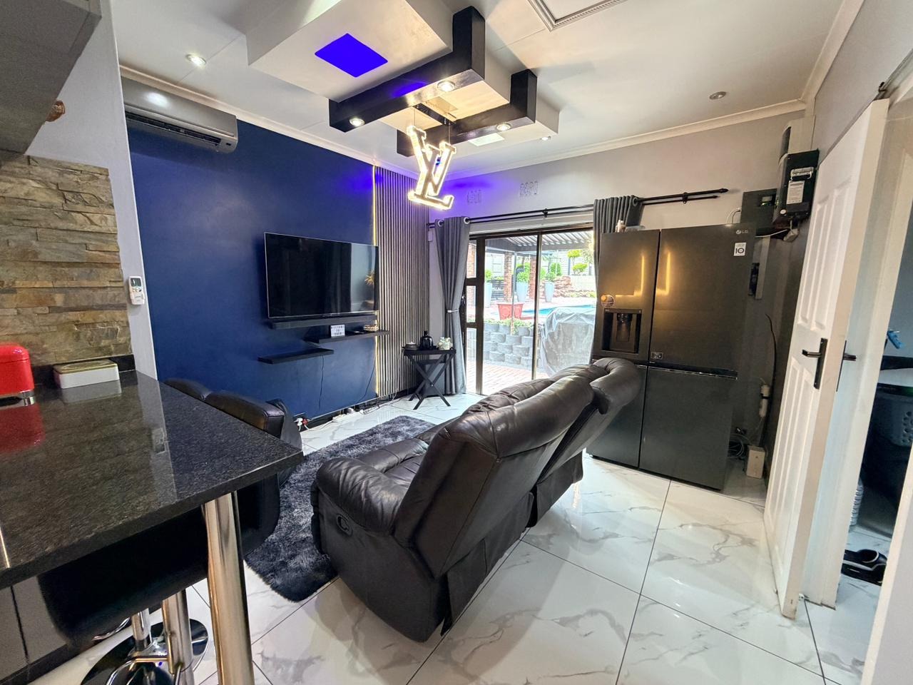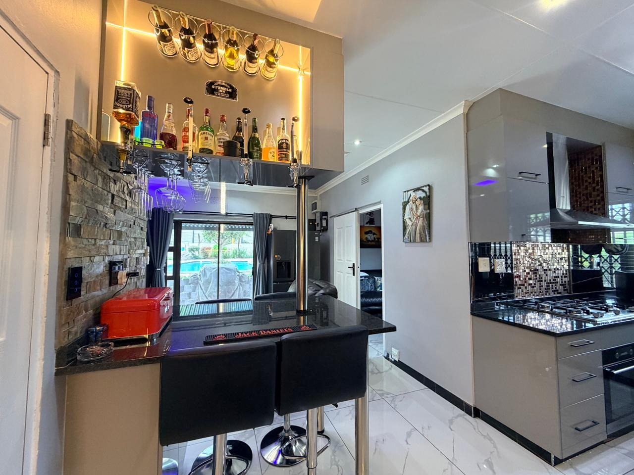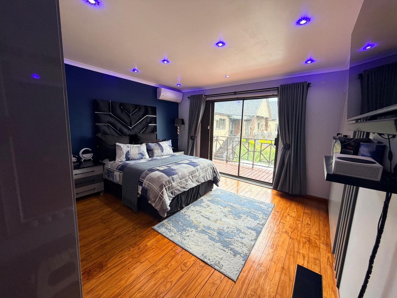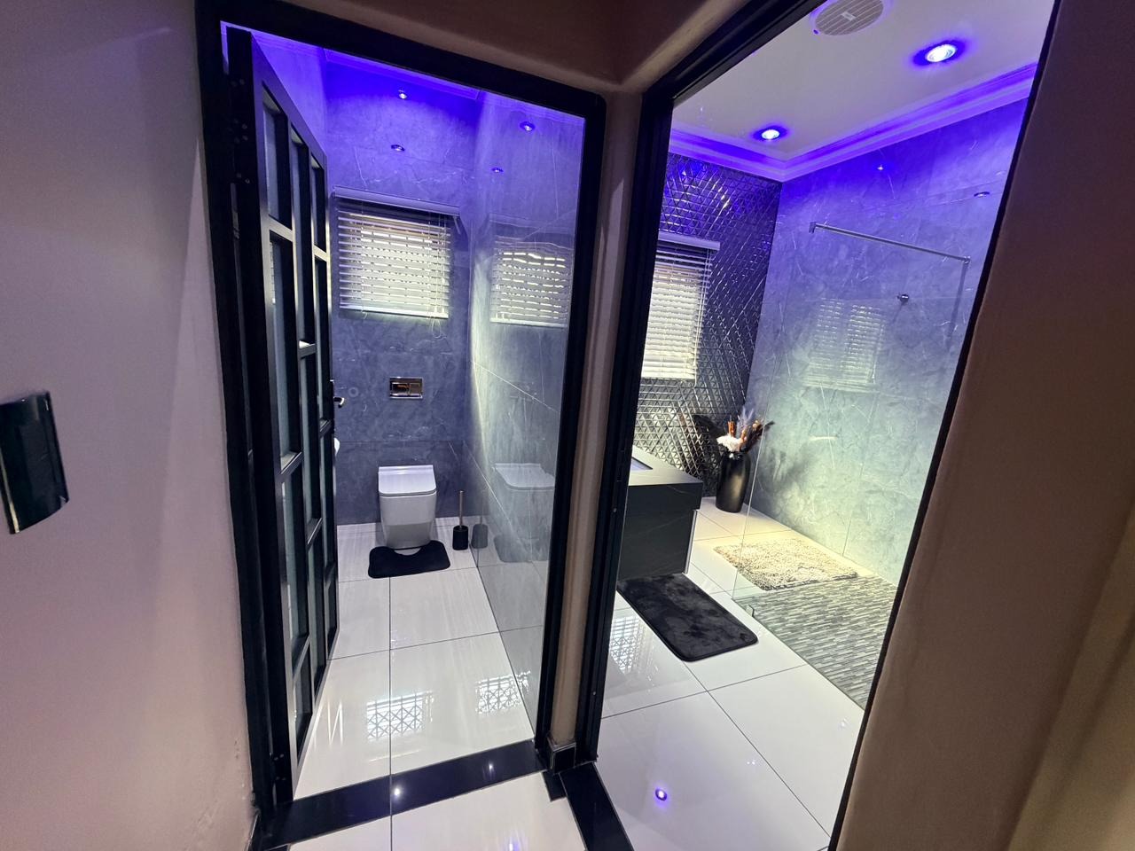 Luxurious, massive main bedroom with air conditioning ,a walk in closet, designer ensuite bathroom with custom shower, Geberit in wall system and a floating toilet. All bedrooms come with air conditioning, built in cupboards and headboards. Fourth bedroom is currently used as a prayer room which can be easily converted into a bedroom. Fully fitted modern kitchen with centre island, glass hob &extractor ,dishwasher connections & air conditioning. Enclosed braai area with awnings. Built in fireplace, gas hob and double sink. Massive double garages, sliding doors opening to entertainment are. Interleading fridge room, separate laundry, wash room, storage room and domestic room. Flatlet under basement is accessible via internal stairs is currently used as an office. opens onto the main driveway and pool are. Separate double storey cottage perfect for Airbnb, rental or extended family. Main house has 18 solar panels, two lithium batteries, borehole and a 5000L Jo Jo tank. High boundary walls & electric fencing all around makes it very safe and secure. This property is fully off-grid, move in ready and very secure and private.