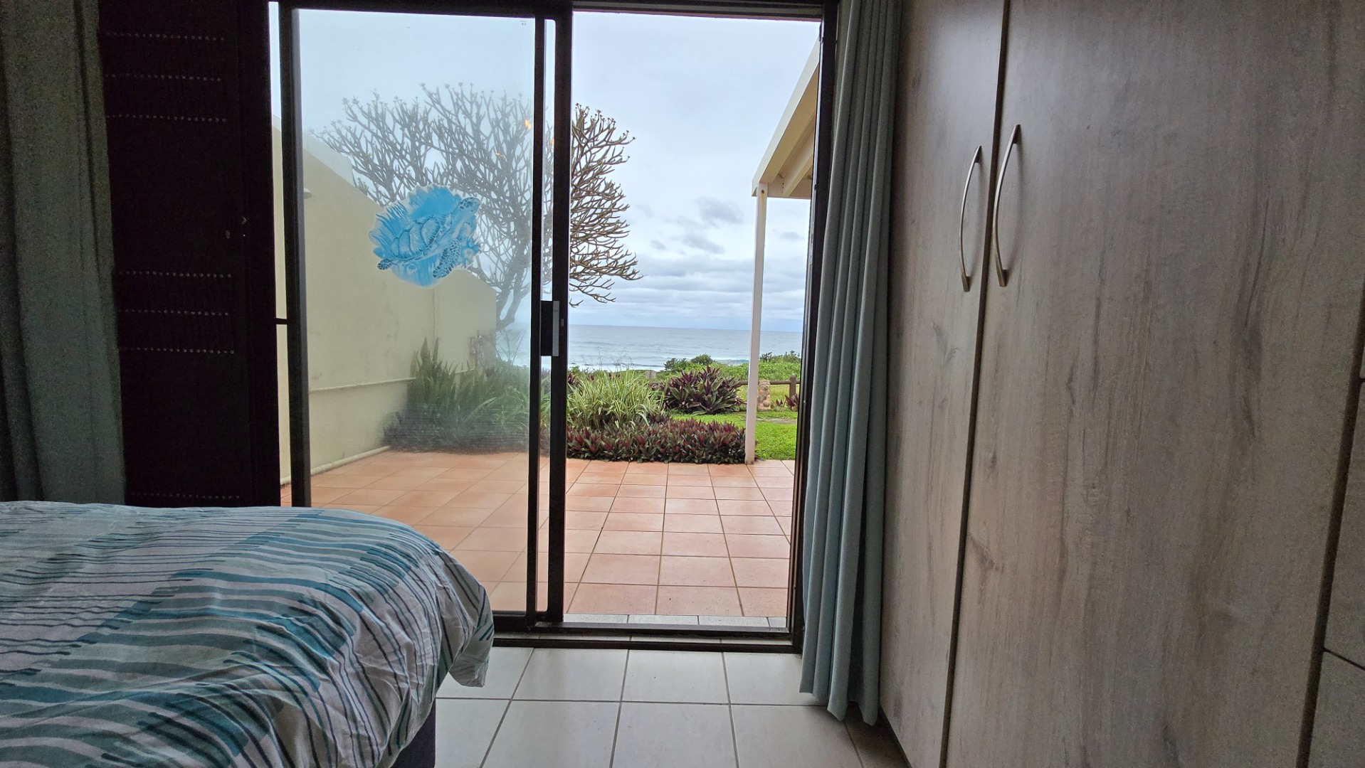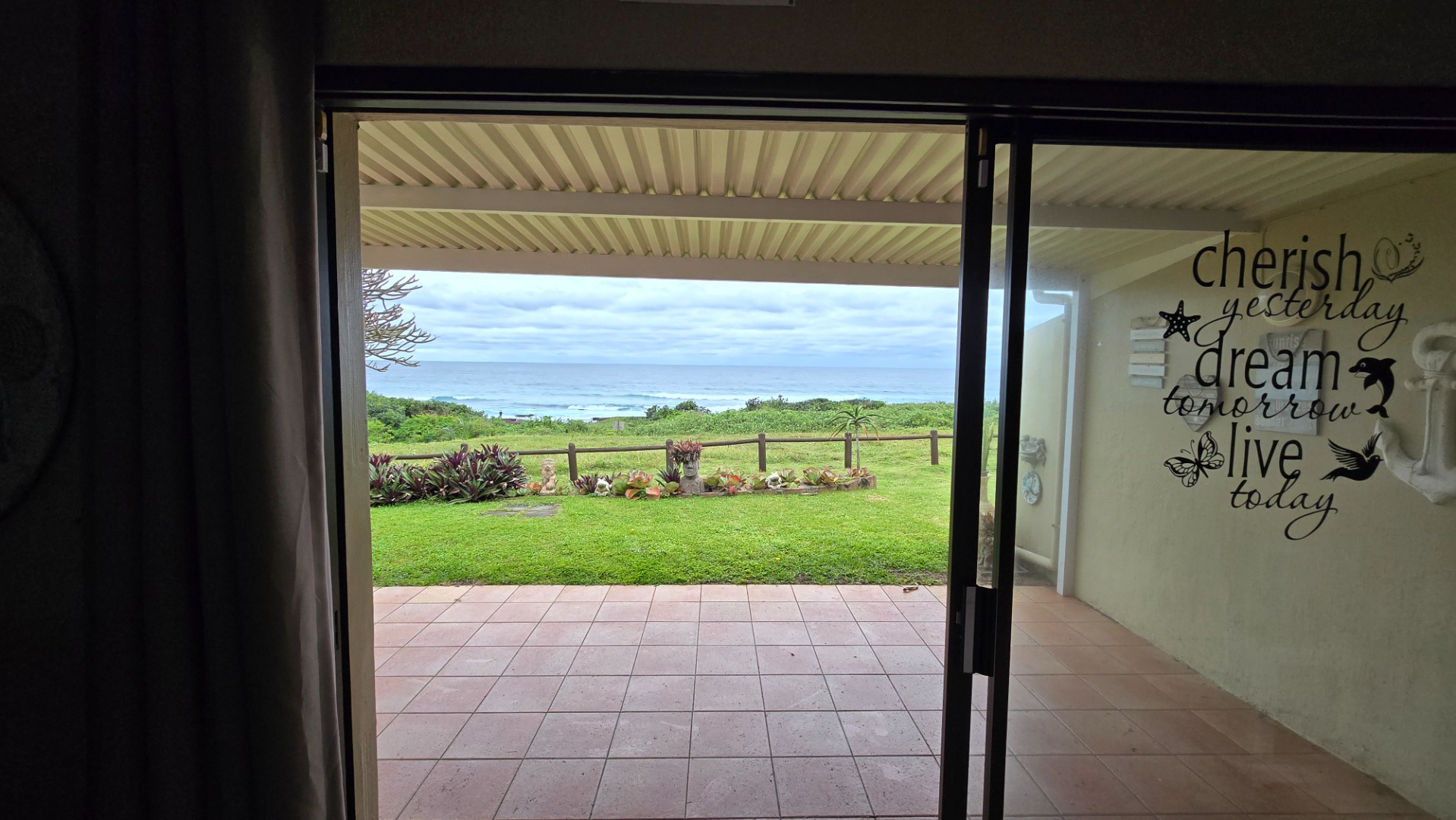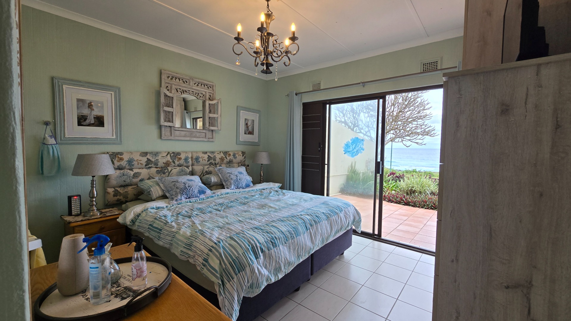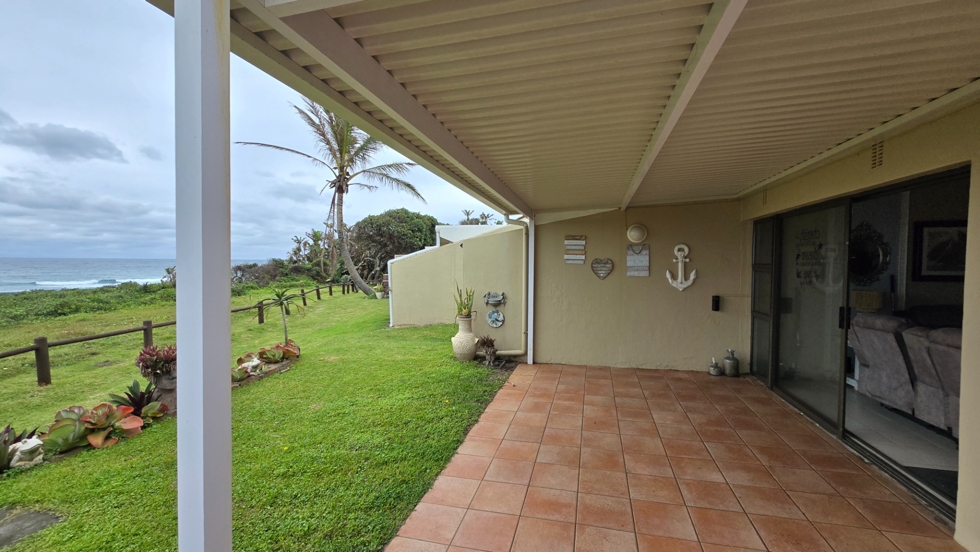 Step outside to embrace the idyllic outdoor living. A spacious, covered patio with large sliding glass doors provides abundant natural light and offers captivating direct ocean views, leading to a private, well-maintained garden and grassy yard. Enjoy leisurely days by the communal pool or host gatherings at the communal braai area. An outdoor shower is a thoughtful addition for post-beach rinse-offs. The property also includes a single garage and an additional parking bay, with paving for easy access.