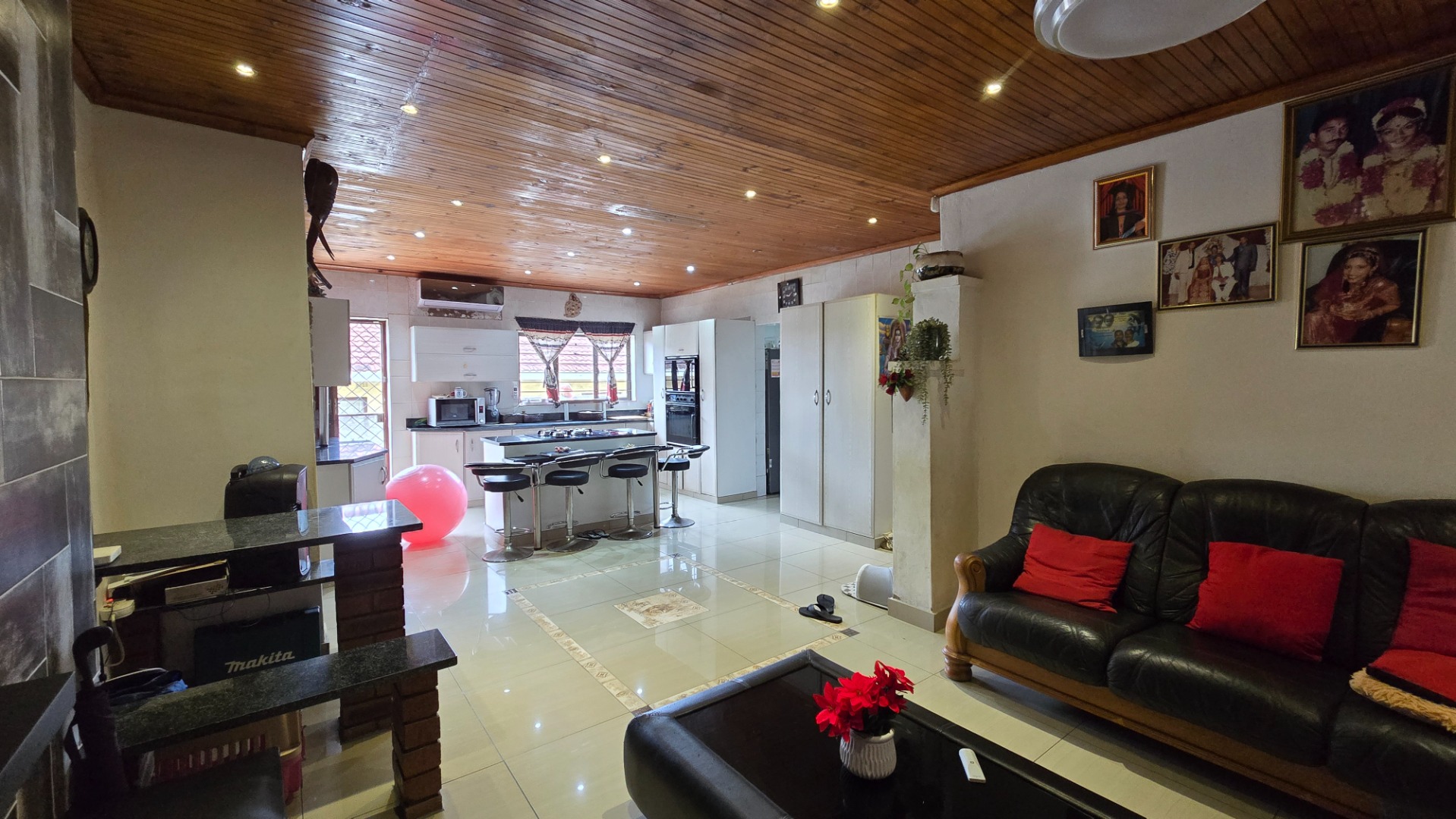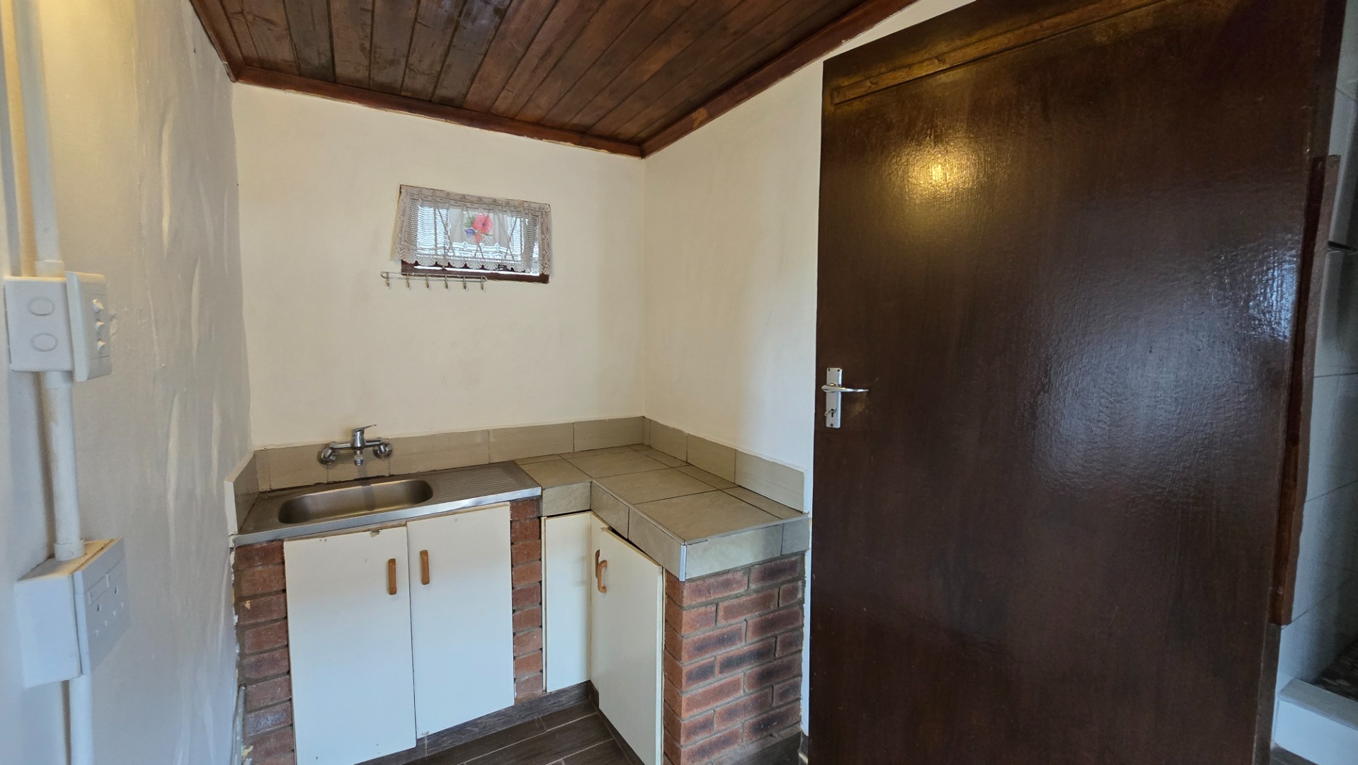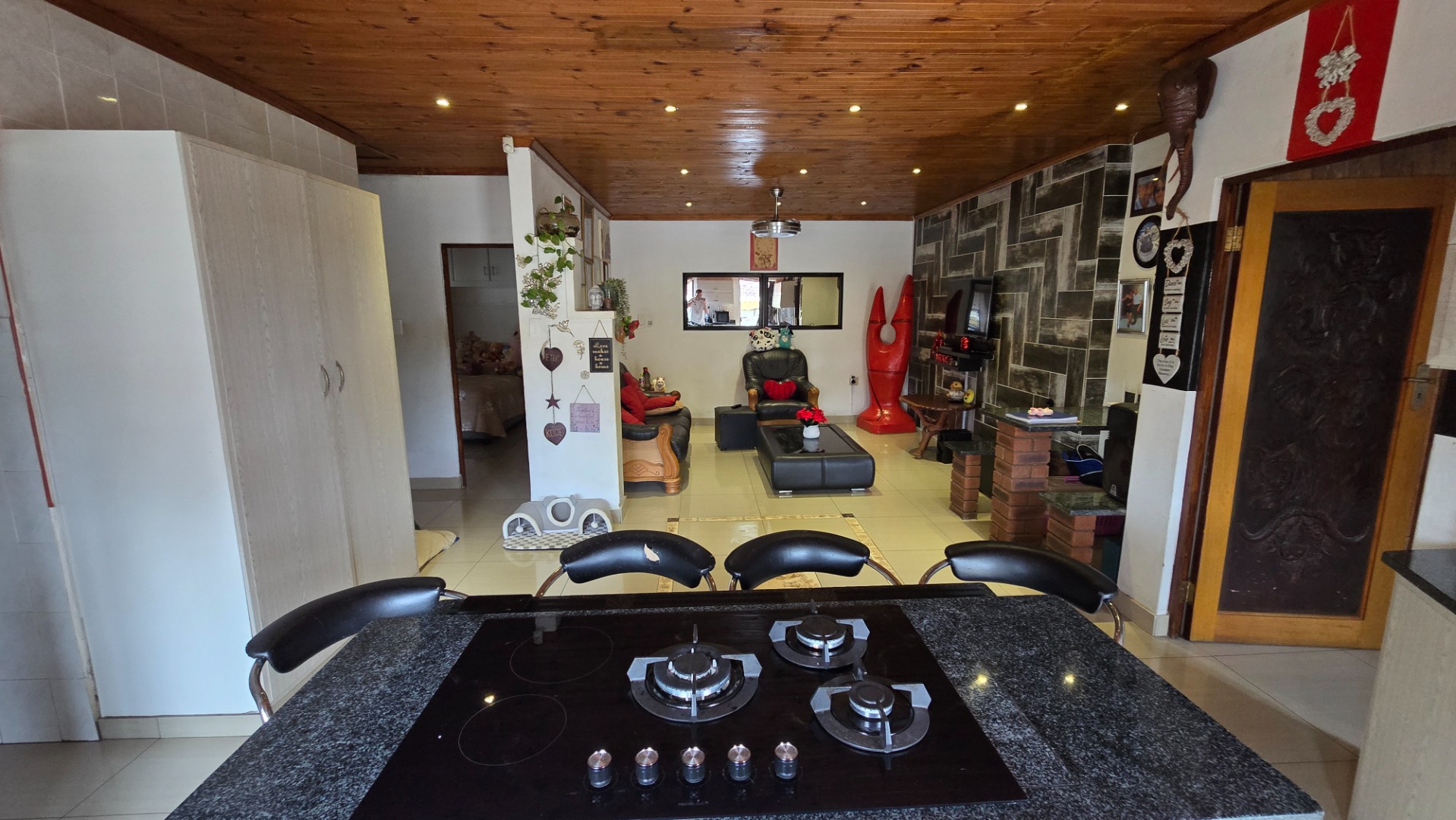 The main residence features two bedrooms and two bathrooms, including an expansive main bedroom with dressing area and en-suite. The open-plan lounge and kitchen are fully tiled and finished with granite countertops, ample cabinetry, and a combination gas and electric stove with dual ovens, flowing into a practical living space ideal for everyday family living. Attached to the main house are two flatlets—a bachelor unit and a one-bedroom unit—which can remain income-generating or be incorporated into the home to accommodate a larger family. A staircase from one of these flatlets leads to a slabbed roof, presenting a valuable opportunity for further development or additional accommodation, subject to approvals.
