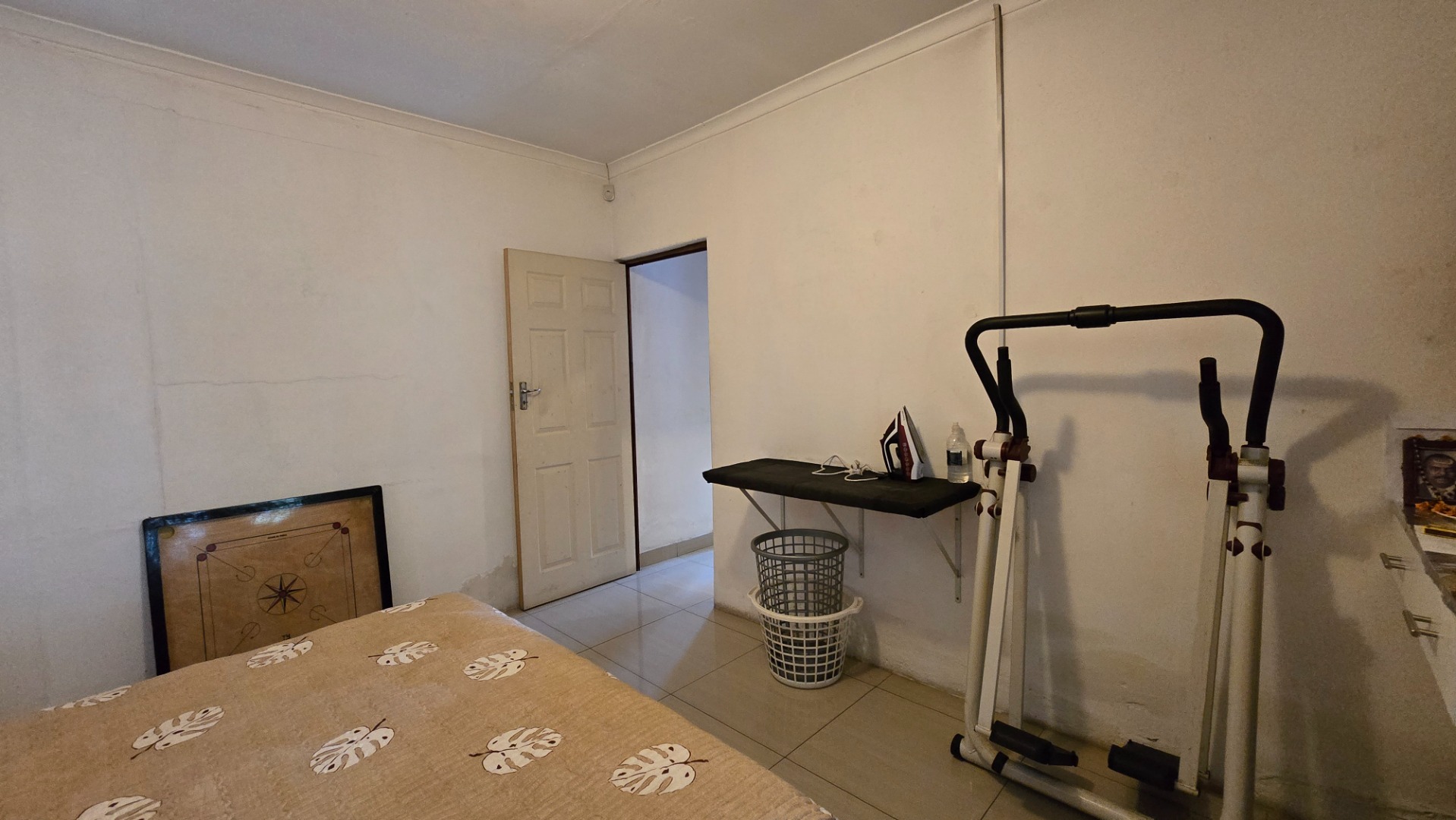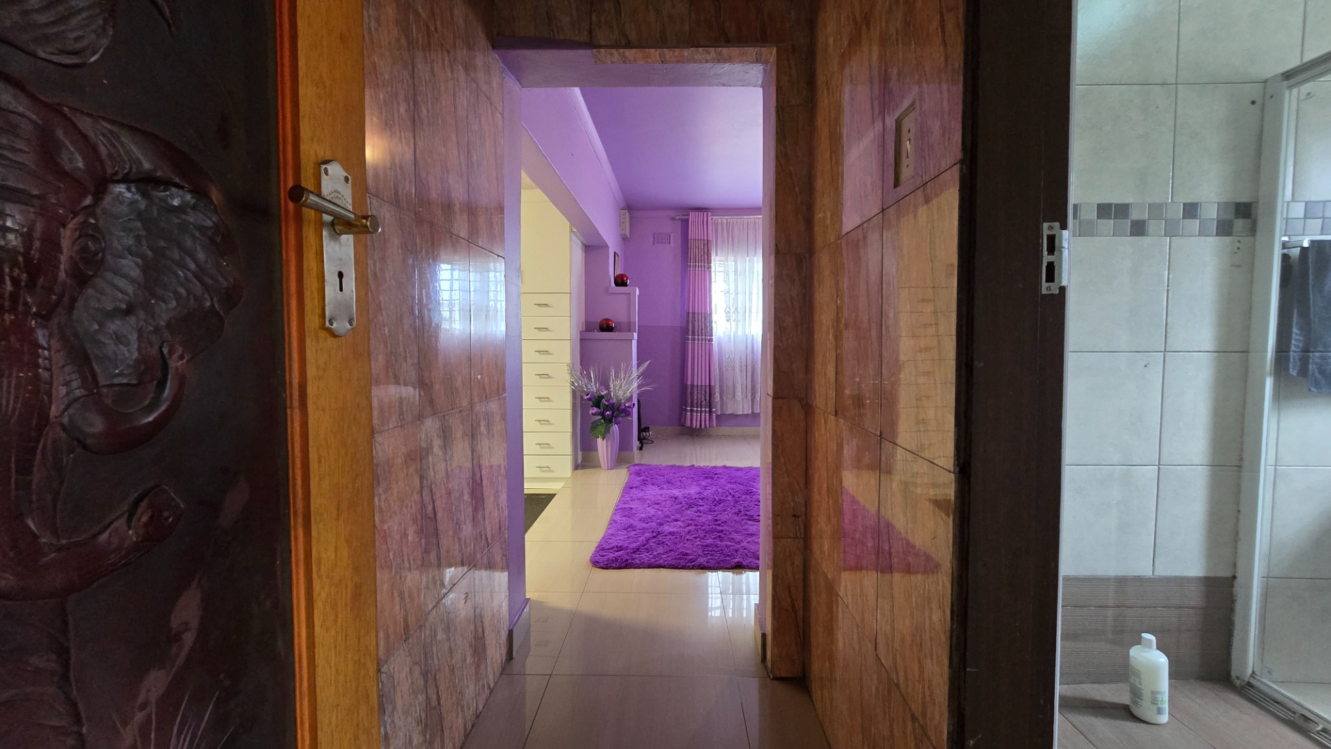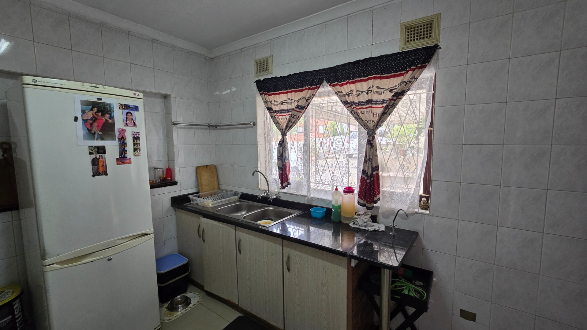 The main residence features two bedrooms and two bathrooms, including an expansive main bedroom with dressing area and en-suite. The open-plan lounge and kitchen are fully tiled and finished with granite countertops, ample cabinetry, and a combination gas and electric stove with dual ovens, flowing into a practical living space ideal for everyday family living. Attached to the main house are two flatlets—a bachelor unit and a one-bedroom unit—which can remain income-generating or be incorporated into the home to accommodate a larger family. A staircase from one of these flatlets leads to a slabbed roof, presenting a valuable opportunity for further development or additional accommodation, subject to approvals.