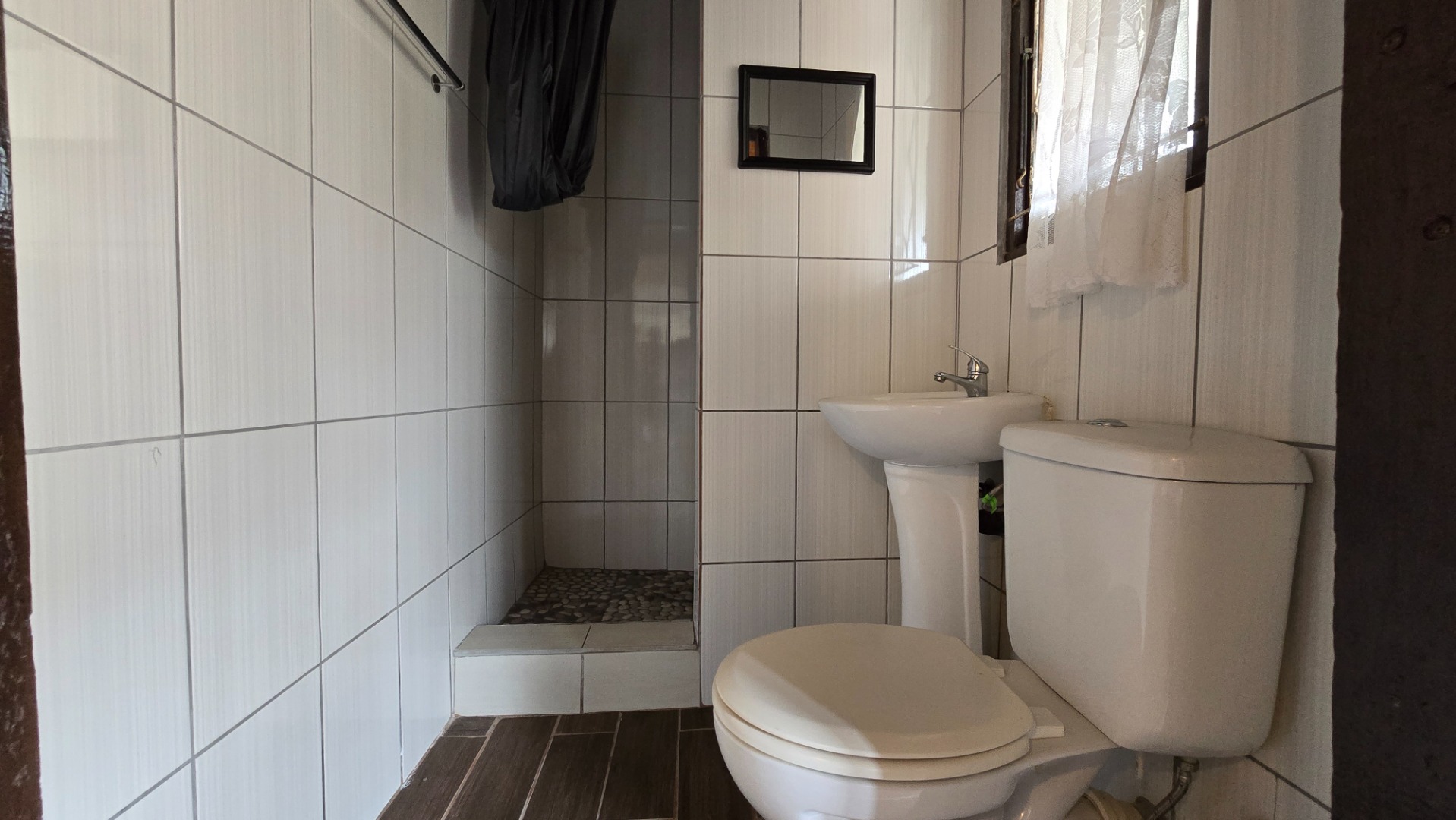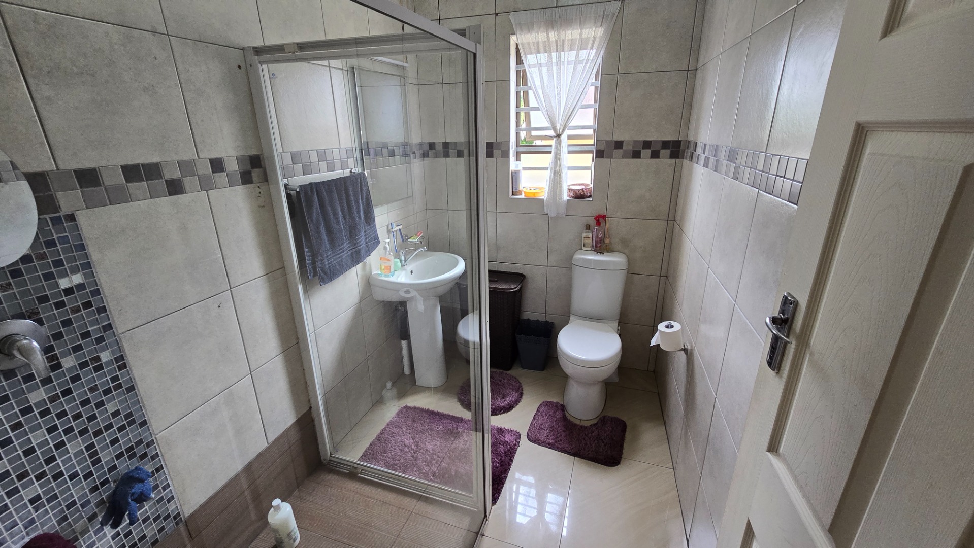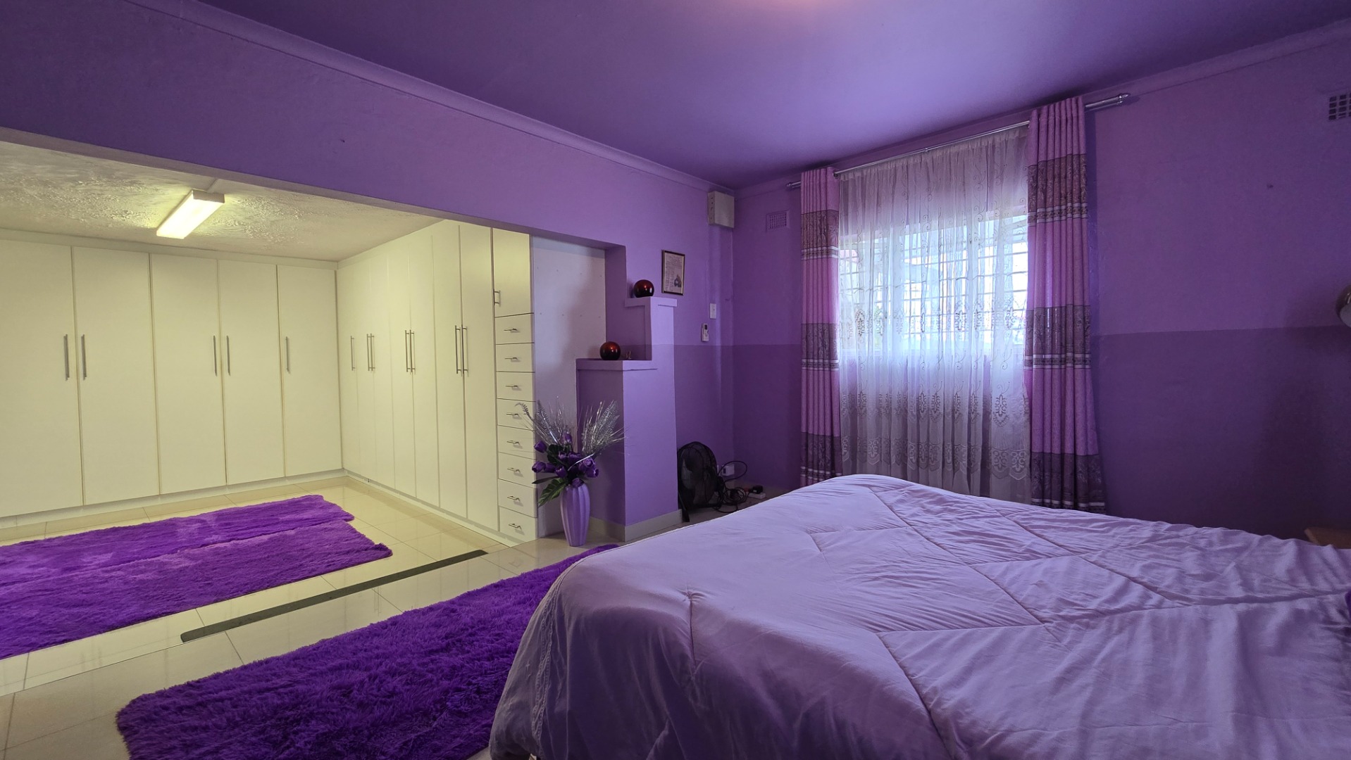 The main residence features two bedrooms and two bathrooms, including an expansive main bedroom with dressing area and en-suite. The open-plan lounge and kitchen are fully tiled and finished with granite countertops, ample cabinetry, and a combination gas and electric stove with dual ovens, flowing into a practical living space ideal for everyday family living. Attached to the main house are two flatlets—a bachelor unit and a one-bedroom unit—which can remain income-generating or be incorporated into the home to accommodate a larger family. A staircase from one of these flatlets leads to a slabbed roof, presenting a valuable opportunity for further development or additional accommodation, subject to approvals.