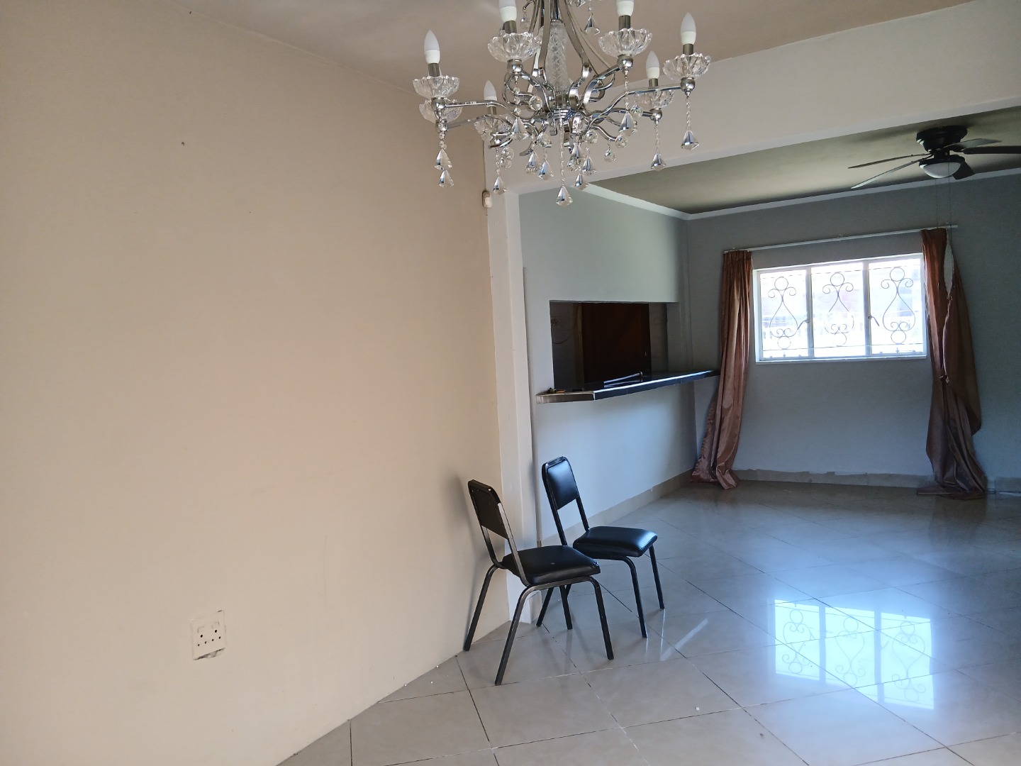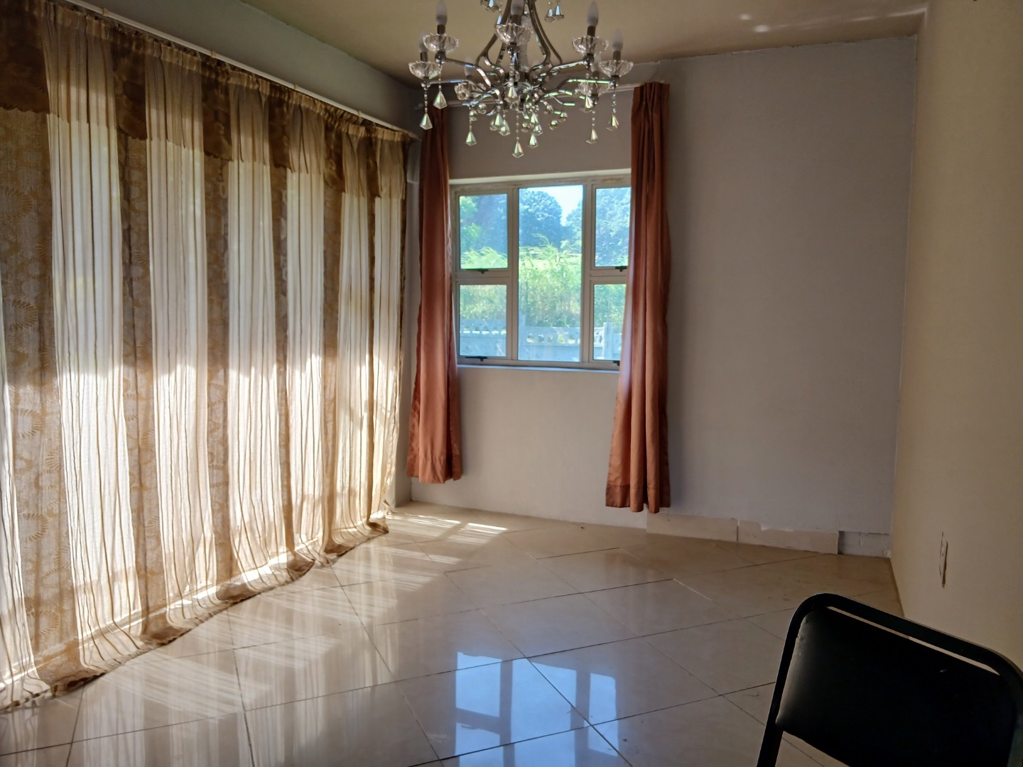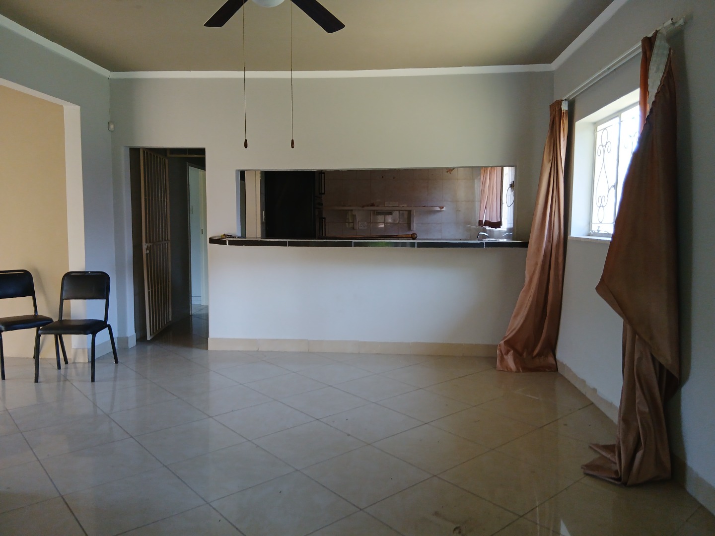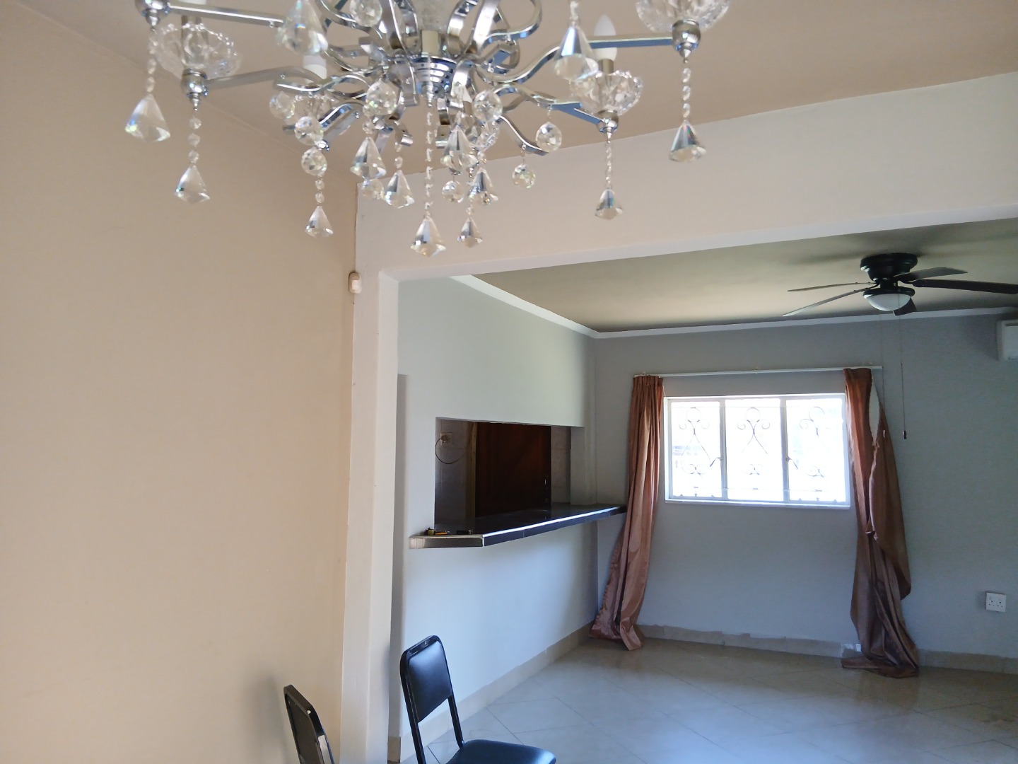 Step into an inviting interior featuring an open-plan layout that seamlessly connects the living spaces. The home boasts a comfortable lounge and a dedicated dining room, both benefiting from abundant natural light through large windows and sliding doors. Tiled flooring throughout ensures easy maintenance, complemented by ceiling fans for comfort and a decorative chandelier adding a touch of elegance to the main living area. A practical counter/bar area divides the main living space, hinting at a functional kitchen.