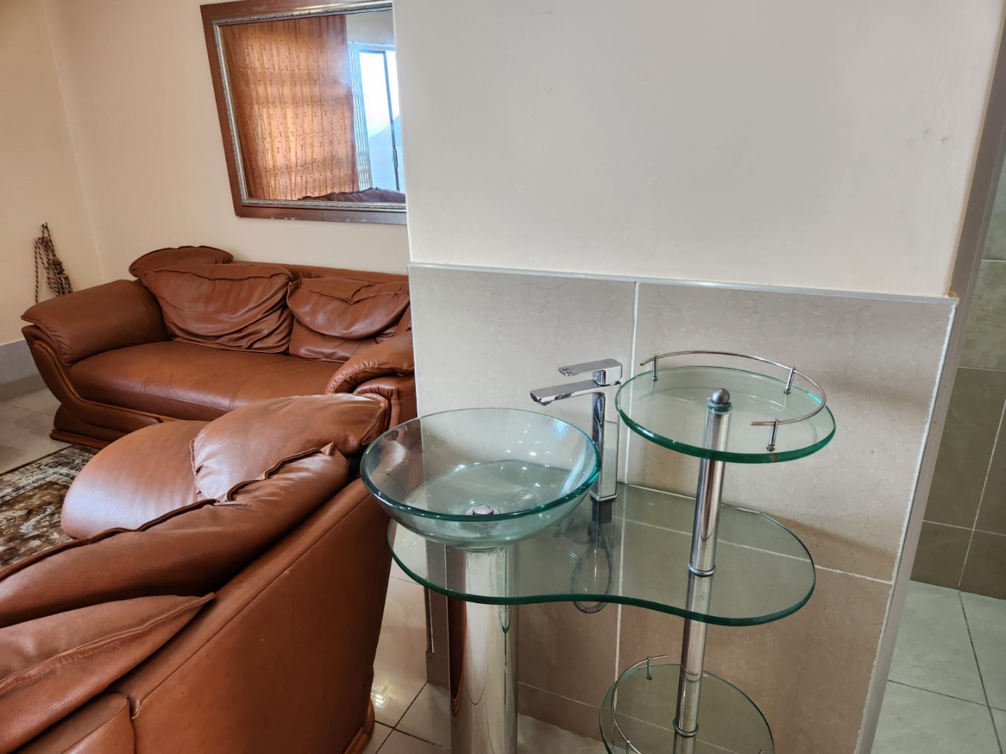 Inside, the unit features inviting living spaces designed for everyday comfort. The lounge area is equipped with seating, complemented by a spacious dining area that includes a glass-top table, ideal for meals and entertaining. Tiled flooring extends throughout these areas, ensuring easy maintenance.