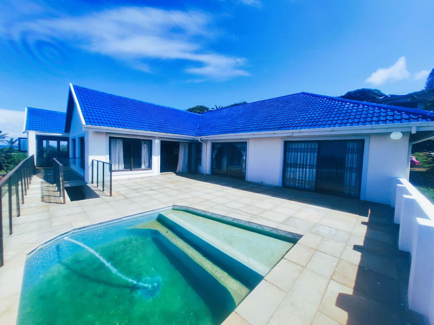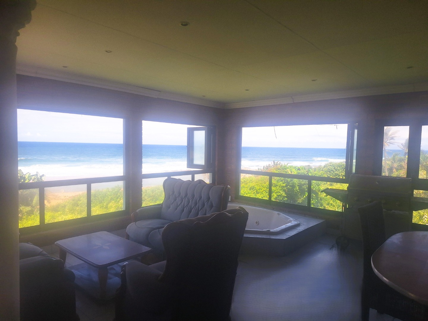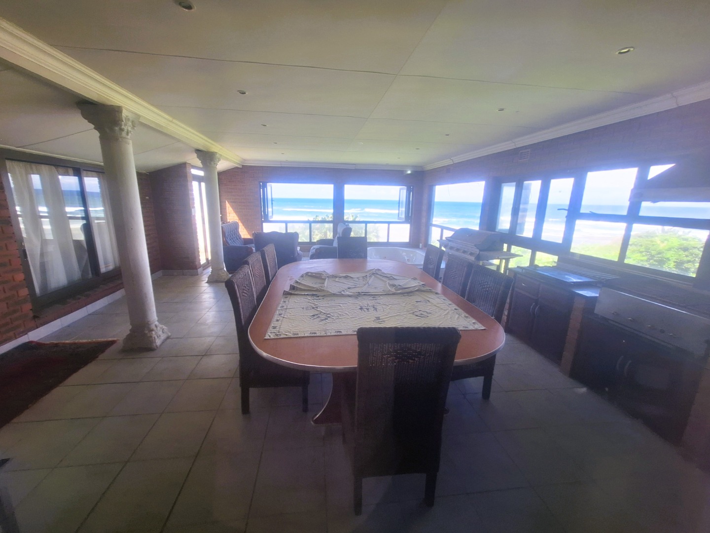 Well designed, up market and furnished Beachfront home in the prime suburb of Umzumbe KZN. This amazing property was practically designed with very spacious and centrally located open plan Kitchen and living spaces effortlessly flowing from the dining room, build in Bar area with Poker table into the Magnificent lounge with impressive chandelier, Breathtaking braai room enclosed veranda with build in Jacuzzi, braais and entertainment area. It also offers a large open veranda with swimming pool.