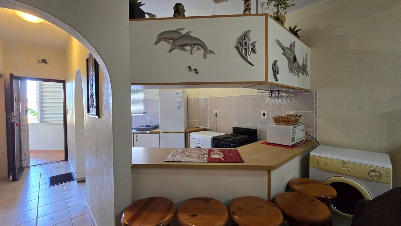 Discover comfortable coastal living in this inviting 2-bedroom, 2-bathroom apartment, ideally situated within a secure complex in Manaba Beach. Spanning 93 square meters, this furnished residence offers a seamless open-plan layout. The lounge area, with neutral walls and tiled flooring, provides a welcoming space. The functional kitchen is fully equipped with essential appliances including a fridge, stove, microwave, and washing machine, complemented by ample storage and a breakfast bar. Sliding doors open to a private balcony, offering a tranquil garden view.