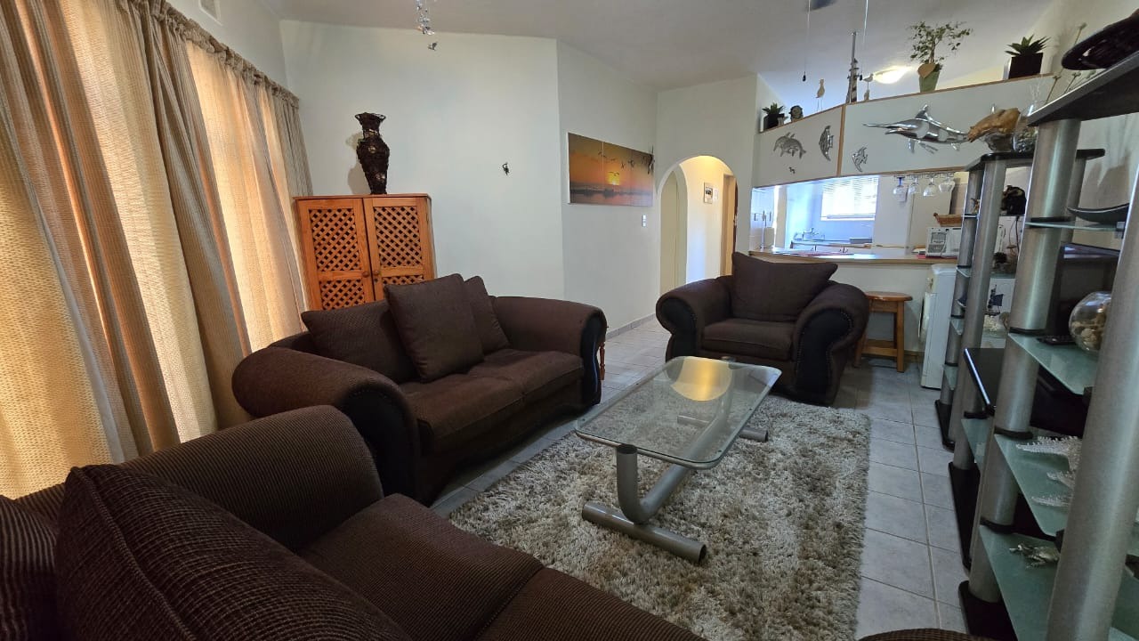 Discover comfortable coastal living in this inviting 2-bedroom, 2-bathroom apartment, ideally situated within a secure complex in Manaba Beach. Spanning 93 square meters, this furnished residence offers a seamless open-plan layout. The lounge area, with neutral walls and tiled flooring, provides a welcoming space. The functional kitchen is fully equipped with essential appliances including a fridge, stove, microwave, and washing machine, complemented by ample storage and a breakfast bar. Sliding doors open to a private balcony, offering a tranquil garden view.